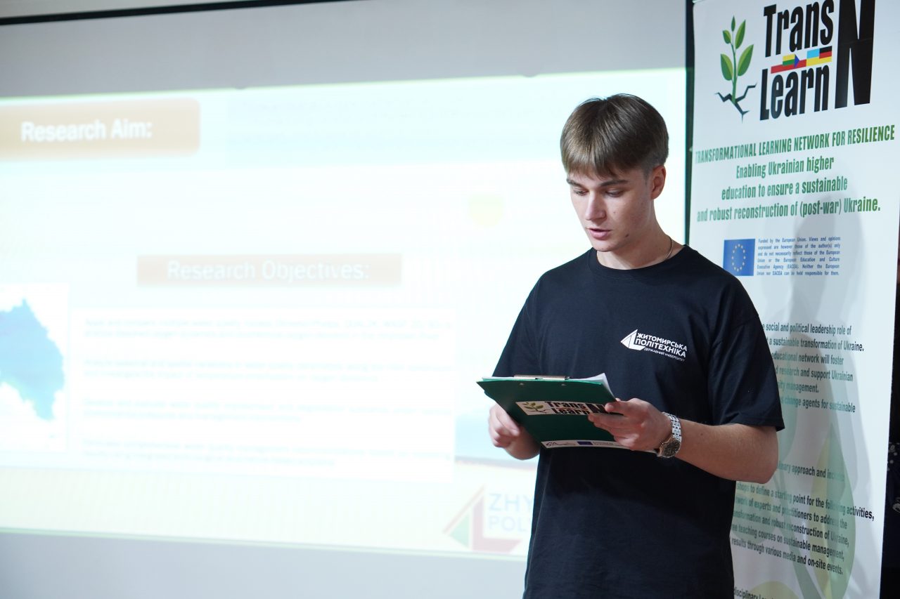- Гула Олександра (2 курс) презентувала роботу на тему «Водно-балансові характеристики малих річок Житомирського району як основа екологічно безпечного водогосподарського планування». Науковий керівник – Скиба Галина, доцент, кандидат технічних наук, доцент кафедри наук про Землю.