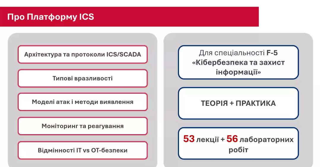 «Платформа ICS» – це віртуальний освітній простір для навчання кіберзахисту автоматизованих систем управління технологічними процесами (SCADA/ICS), який дозволяє: