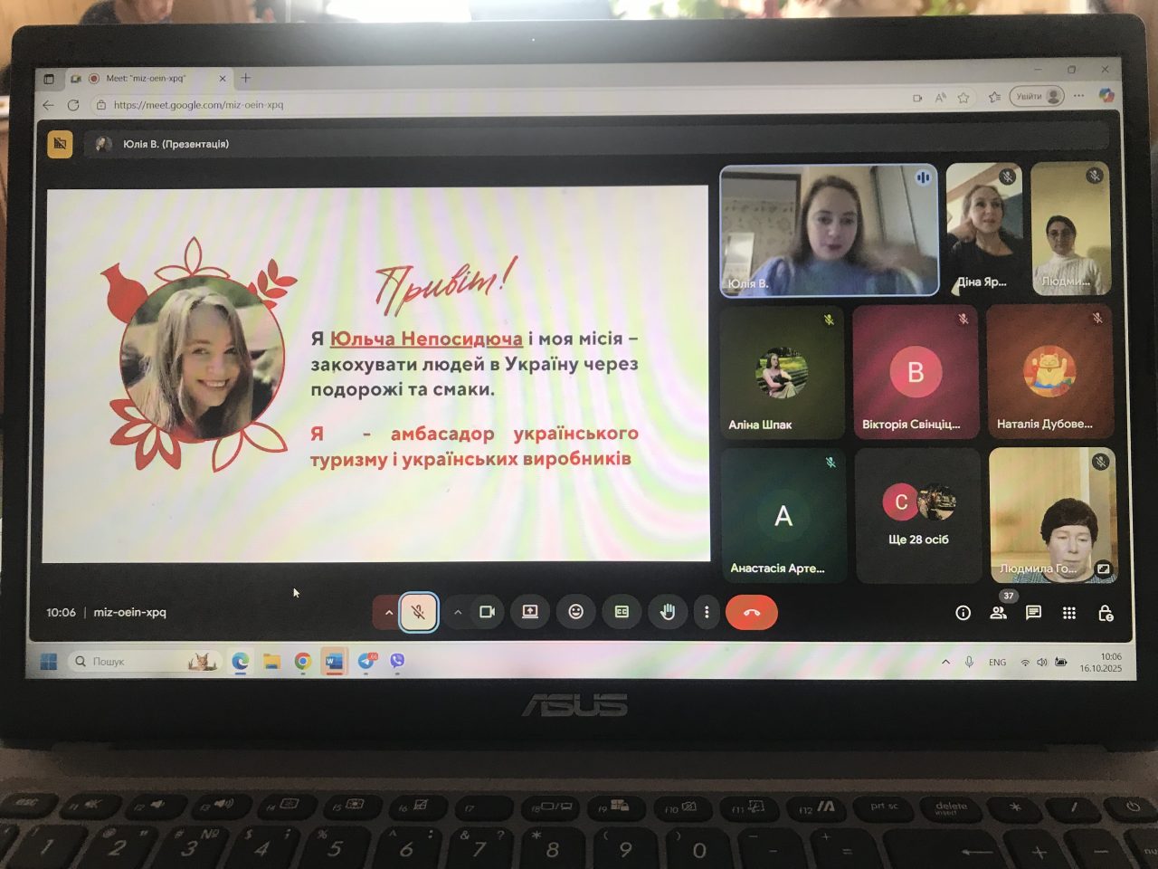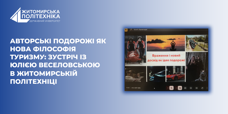 16 жовтня 2025 року відбулася відкрита онлайн-лекція з підприємницею, засновницею бренду «Юльча Непосидюча», організаторкою авторських подорожей Україною та гастроентузіасткою Юлією Веселовською на тему: «Авторські подорожі: маркетинговий хід, міф чи еволюція подорожей?». Слухачами лекції стали здобувачі вищої освіти 1-4 курсів спеціальності «Туризм і рекреація» та «Готельно-ресторанна справа та кейтеринг».