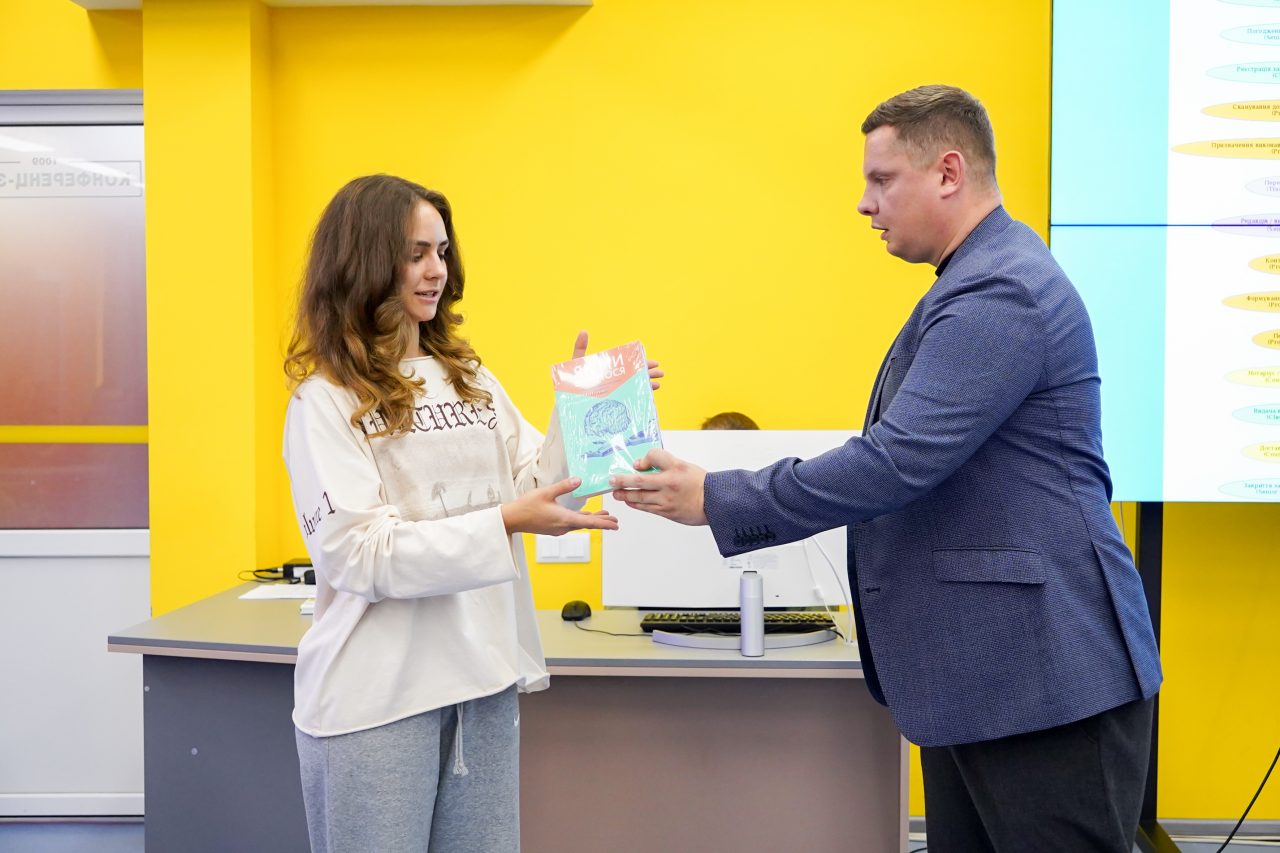 Лекція відбувалася англійською мовою та проходила в інтерактивному форматі: спікер пропонував студентам-філологам розв’язувати проблемні ситуації, з якими стикаються фахівці під час роботи в перекладацькій агенції, та знаходити варіанти відповіді на професійні виклики, спираючись на свої мовні знання та інтуїцію. Найактивніші учасники дискусії, студенти спеціальності «Філологія (Прикладна лінгвістика)»  Вероніка Лелета (3 курс) та Никита Олейников (1 курс), отримали призи: книгу, яка доводить, що штучний інтелект є інструментом у роботі перекладача, а не замінником людини, та худі з логотипом агенції. Наш гість теж отримав подарунки до дня перекладача – мерч Політехніки та книгу з серії детективів Саймона Бекетта, яку перекладала доцент кафедри Євгенія Канчура.