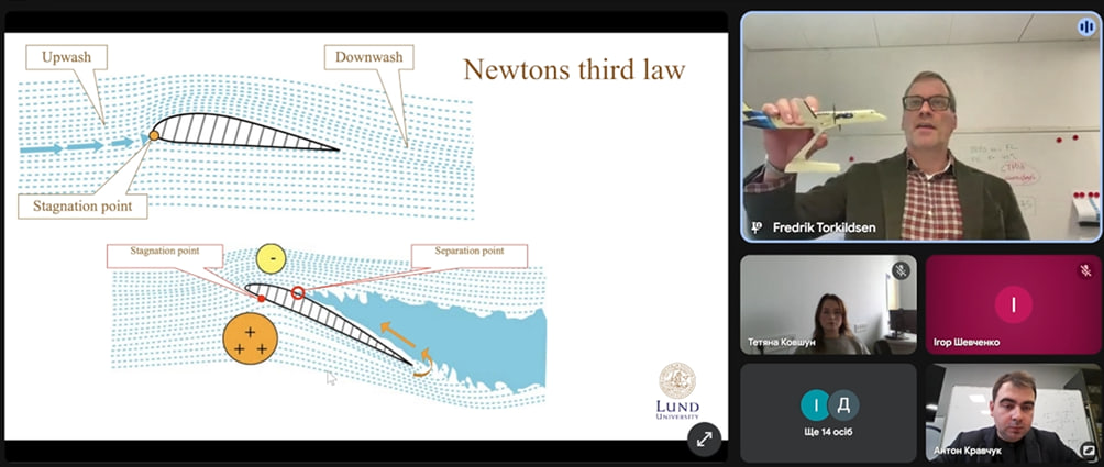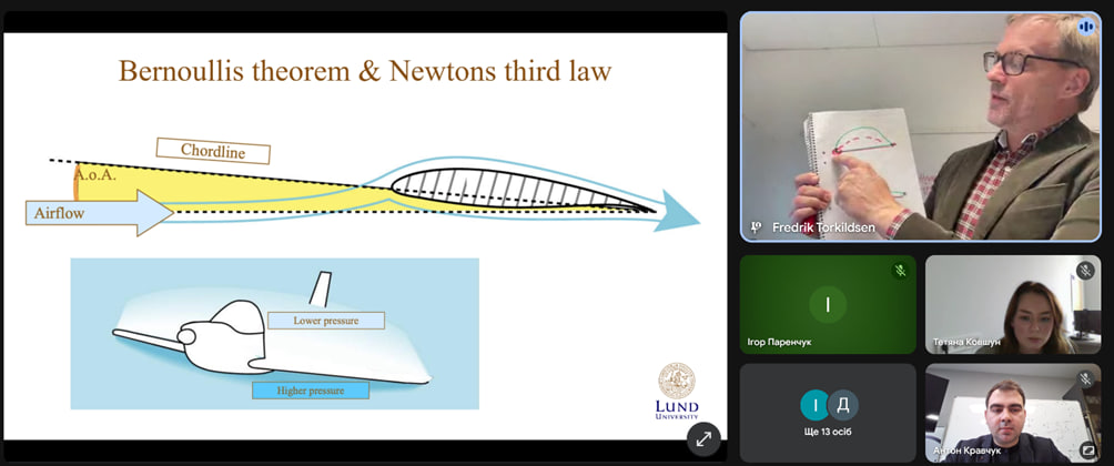 Упродовж лекції Fredrik Torkildsen у доступній формі розповів про основи принципів польоту літальних апаратів літакового типу, а саме про підйомну силу та опір, тягу й вагу, вплив аеродинамічного профілю крила та кута атаки, а також базові аспекти стабільності та керованості. Матеріал був зорієнтований на міждисциплінарну аудиторію й дав студентам цілісне уявлення про фізику польоту та практичні приклади її застосування.