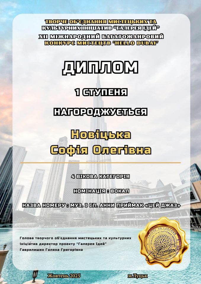Новіцька Софія – Лауреат 1 ступеня ХІІ Міжнародного багатожанрового конкурсу мистецтв «Hello DUBAI»