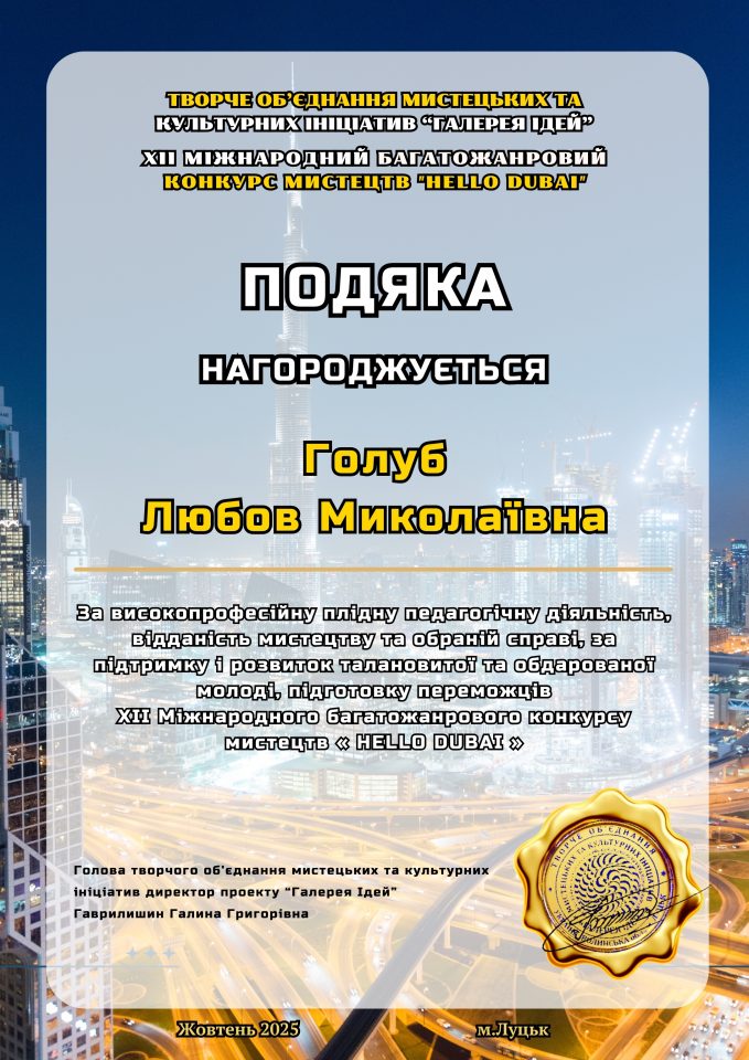 5 жовтня 2025 року відбувся ХІІ Міжнародний багатожанровий конкурс мистецтв «Hello DUBAI» (дистанційно)