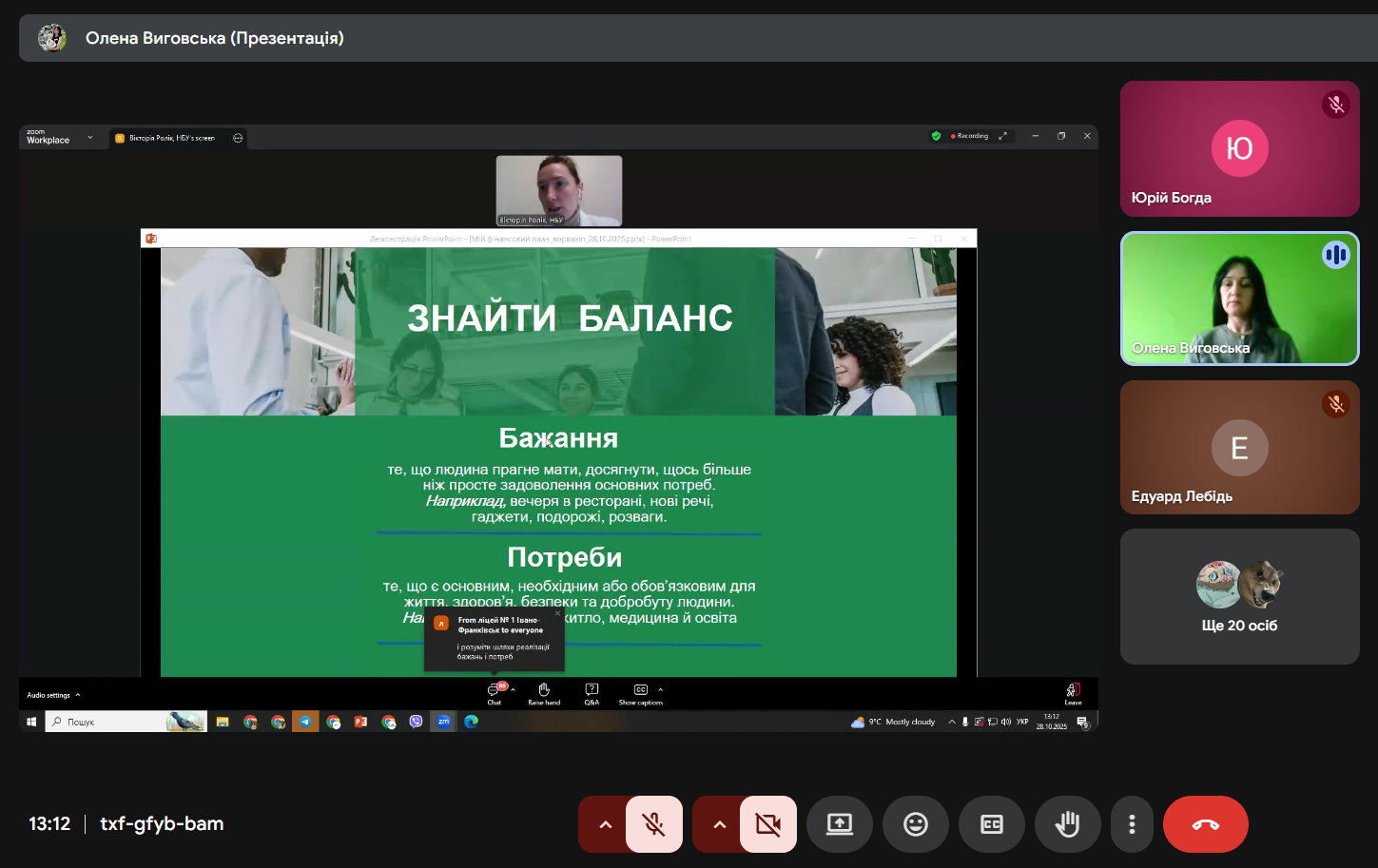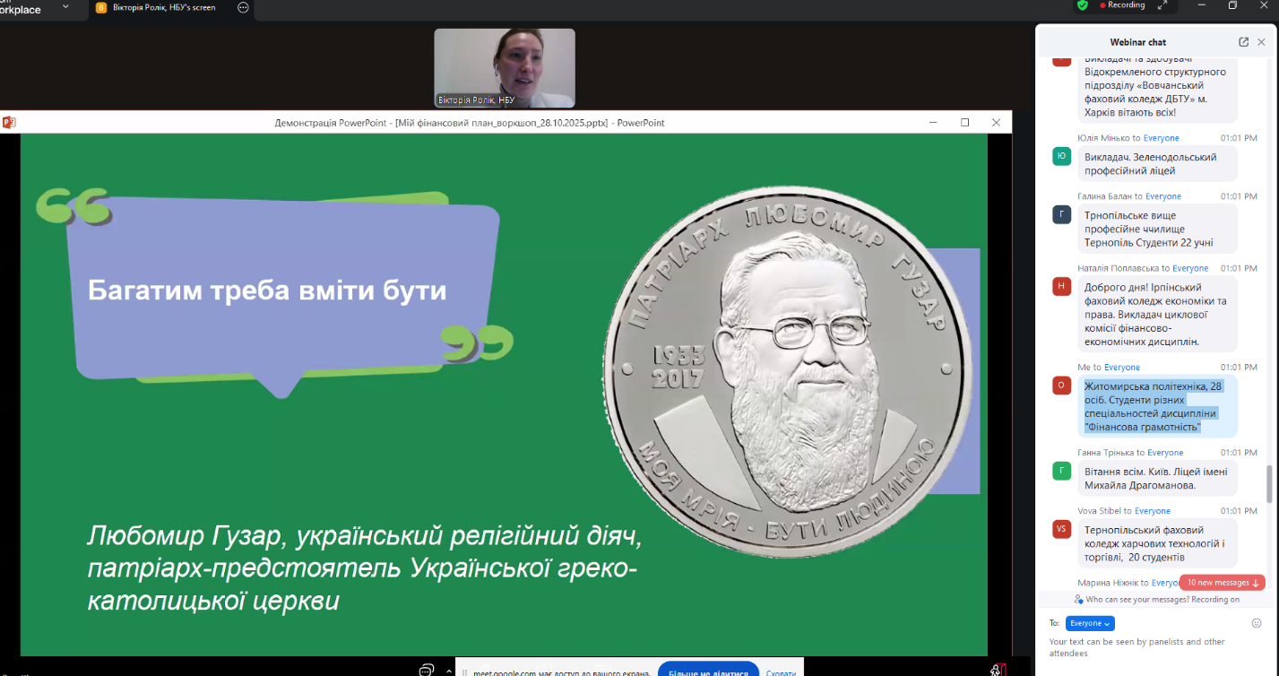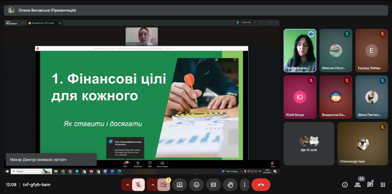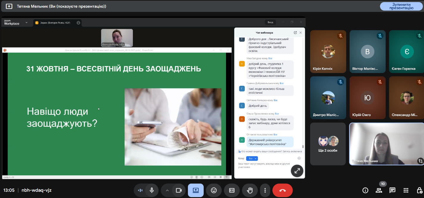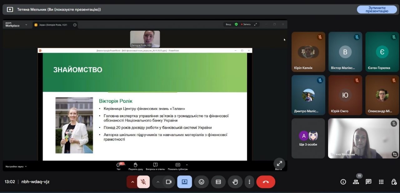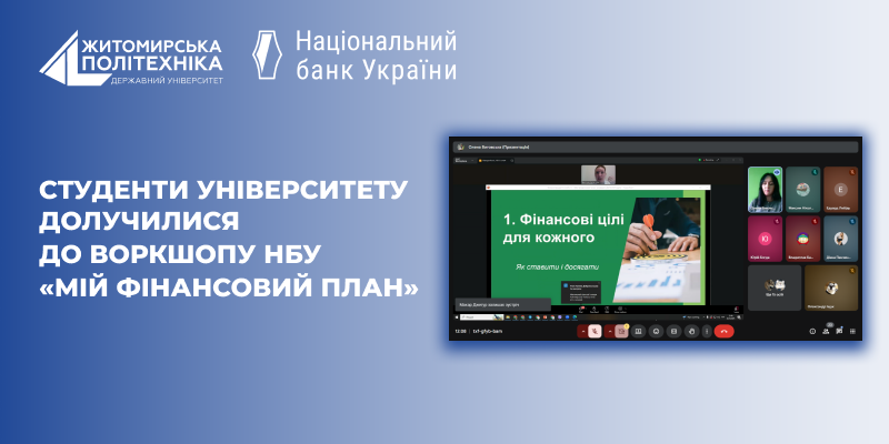 28 жовтня 2025 року здобувачі вищої освіти Державного університету «Житомирська політехніка» освітнього ступеня «бакалавр» в межах вибіркових дисциплін кафедри фінансів та цифрової економіки – «Фінансова грамотність» (викладач Олена Виговська, PhD) та «Організація власного бізнесу» (викладач Тетяна Мельник, к.е.н., доц.) – взяли участь у практичному онлайн-воркшопі «Мій фінансовий план», який провела Вікторія Ролік, головний експерт управління зв’язків з громадськістю та фінансової обізнаності Департаменту комунікацій Національного банку України.