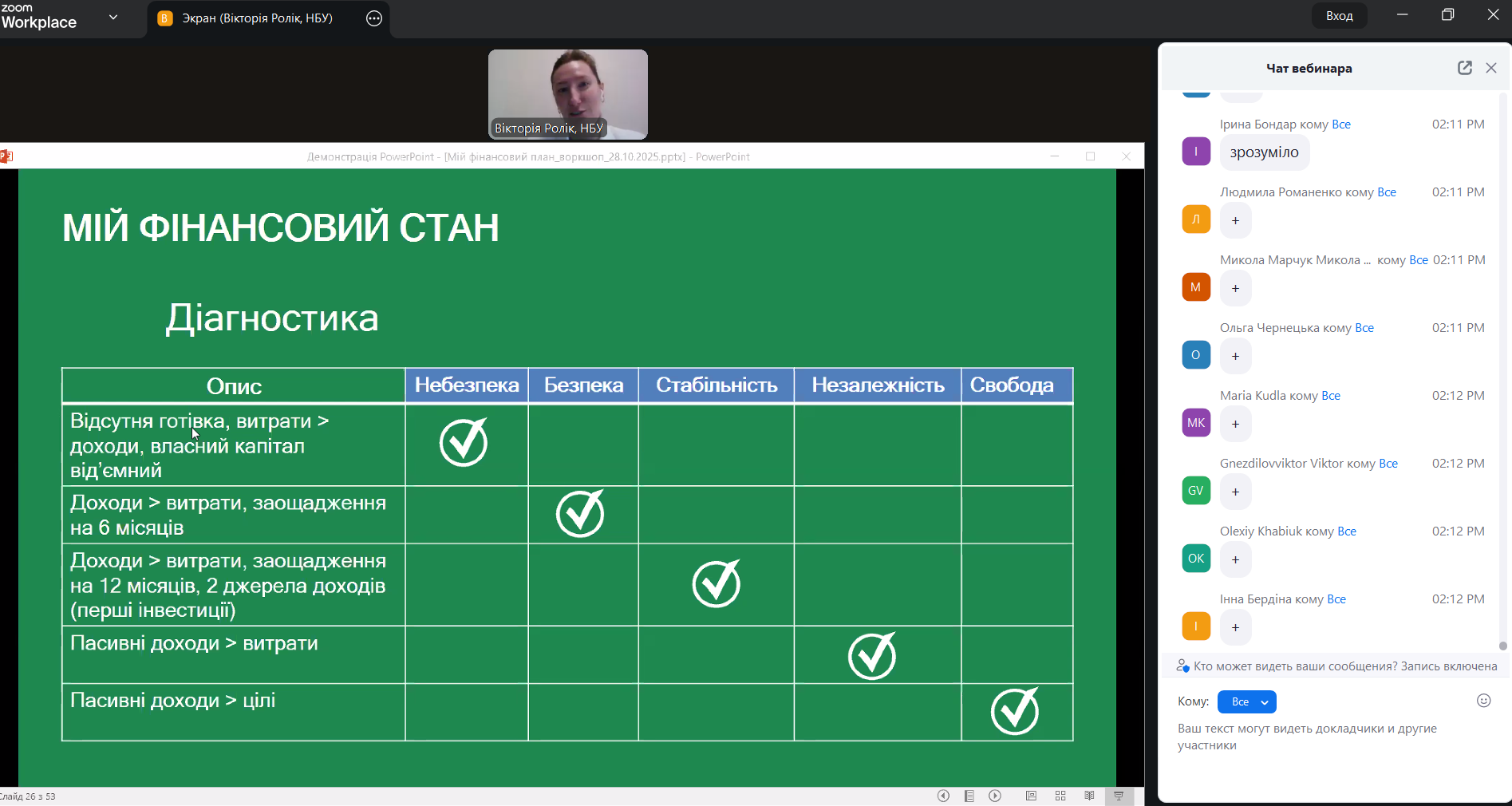 Учасники воркшопу активно взаємодіяли на віртуальній дошці, презентуючи власні фінансові цілі та шляхи їх досягнення, а також долучалися до дискусії в Zoom-чаті. Спікерка заходу, Вікторія Ролік, представила низку практичних інструментів для підвищення фінансової грамотності, зокрема методики самооцінки фінансового стану, моделі формування особистого бюджету та шаблони ведення сімейних фінансів із використанням Google-таблиць.