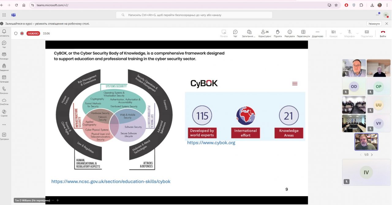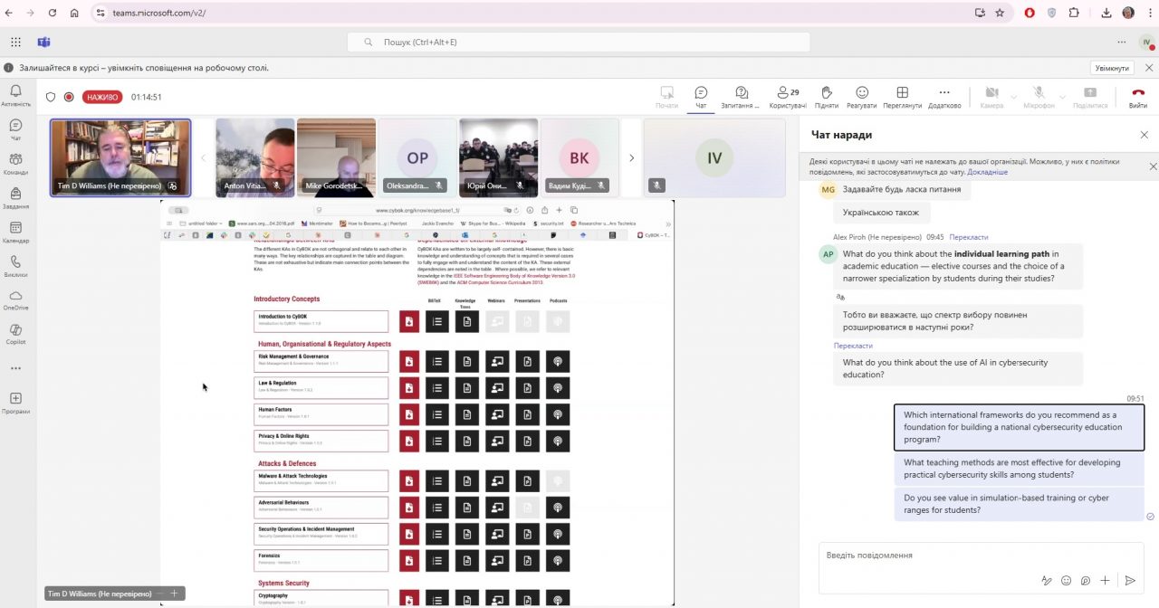 Крім того на лекції було розглянуто передовий досвід у викладанні кібербезпеки та приділено увагу розвитку професійних навичок майбутніх фахівців. Фінального частиною заходу була сесія запитань-відповідей, на якій лектор надав ґрунтовні коментарі на всі поставлені слухачами запитання.