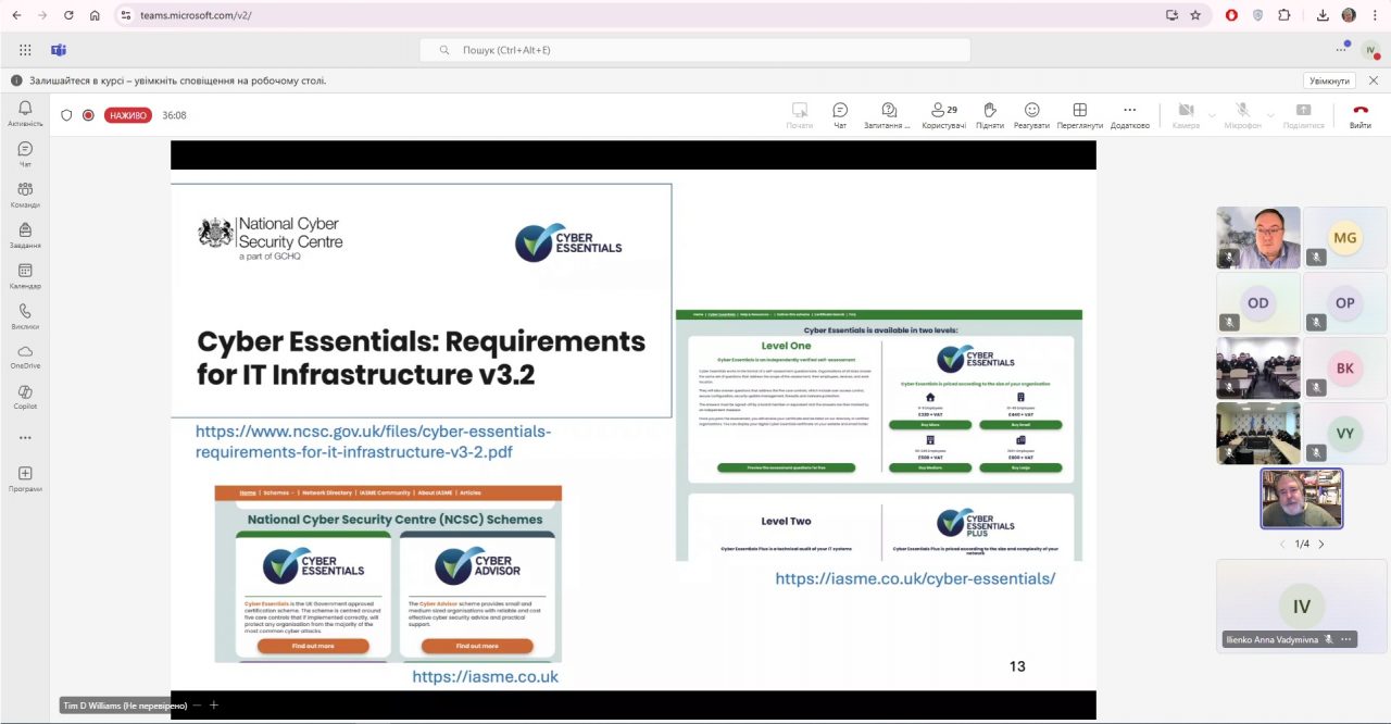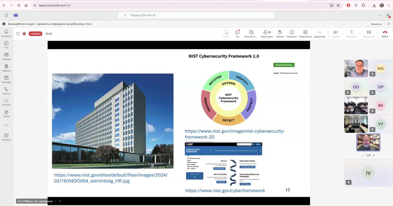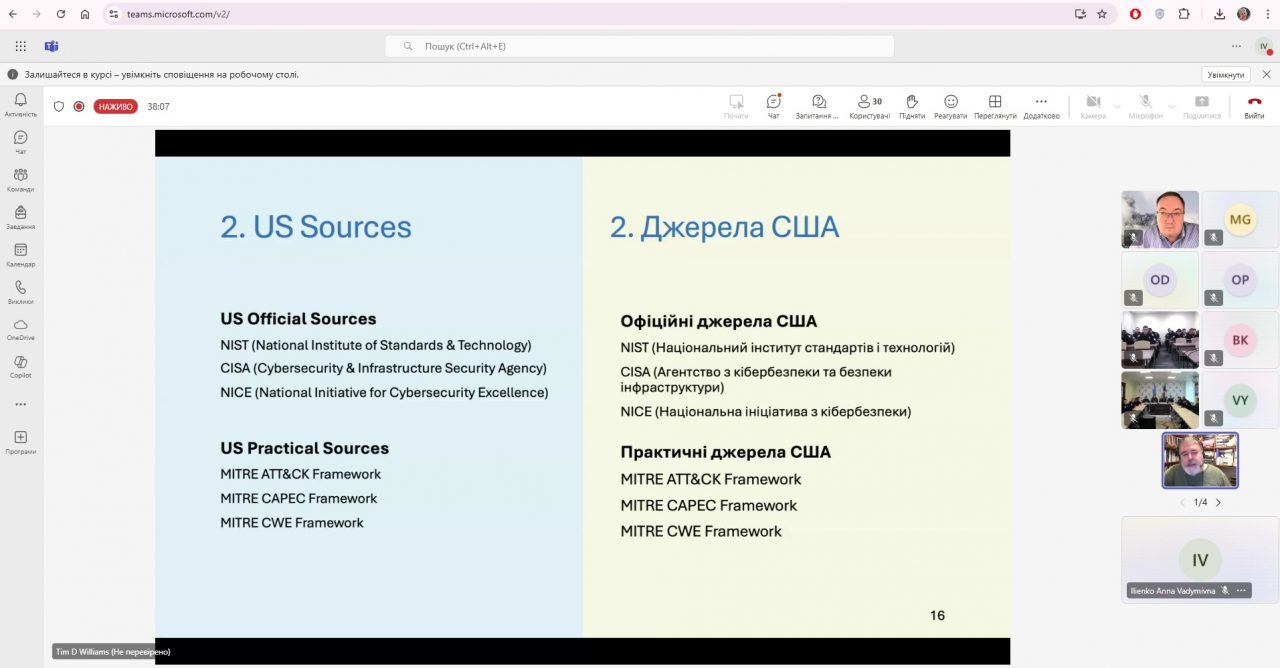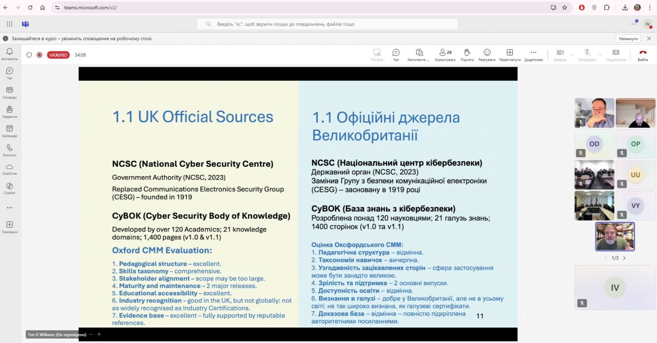 Доповідь професора Тіма Д. Вільямса у першу чергу стосувалася застосування стандартів та програм професійних сертифікацій з кібербезпеки та захисту інформації для розробки освітніх програм, а саме можливостей використовувати такі стандарти та програми як: