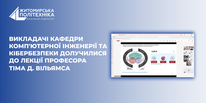 Від Державного університету «Житомирська політехніка» до лекції долучилися гаранти бакалаврської та магістерської освітніх програм «Кібербезпека» Андрій Єфіменко та Володимир Воротніков, представники робочих груп освітніх програм Олексій Шелуха, Олександр Пірог, Олександра Покотило, Вадим Миколайчук, а також викладачі кафедри компʼютерної інженерії та кібербезпеки, які забезпечують провадження освітнього процесу на цих програмах.