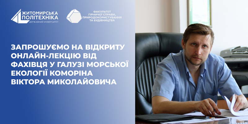 Кафедра наук про Землю Державного університету «Житомирська політехніка» запрошує здобувачів вищої освіти, науково-педагогічних працівників та всіх зацікавлених на відкриту онлайн-лекцію провідного фахівця у галузі морської екології Коморіна Віктора Миколайовича.