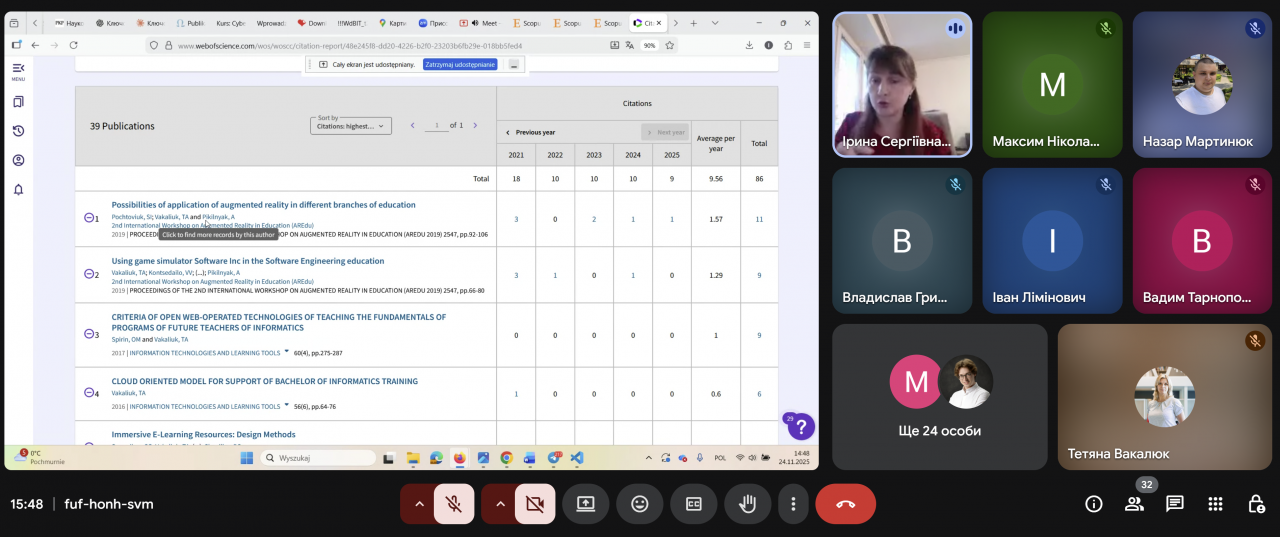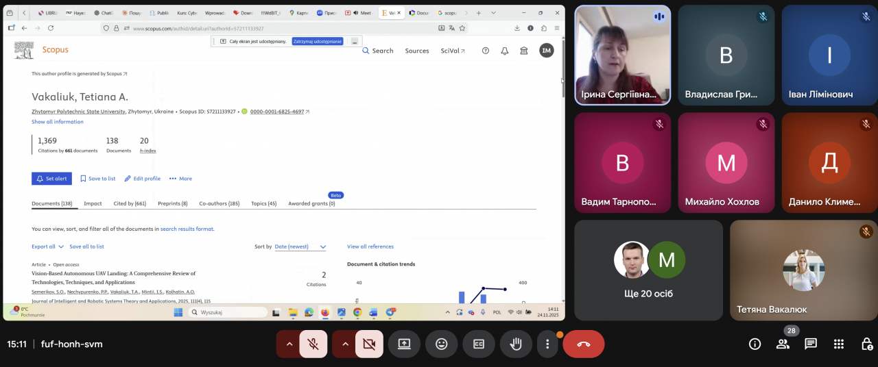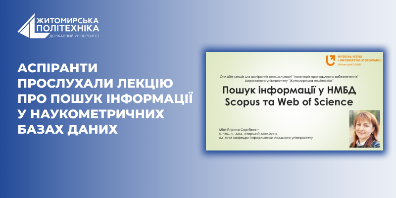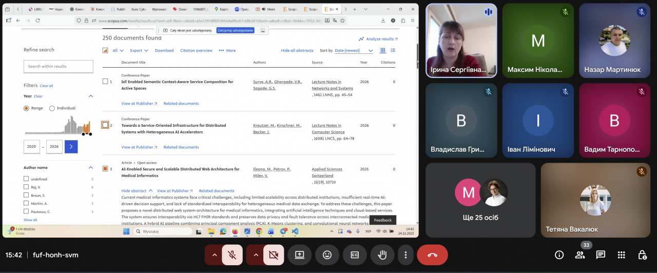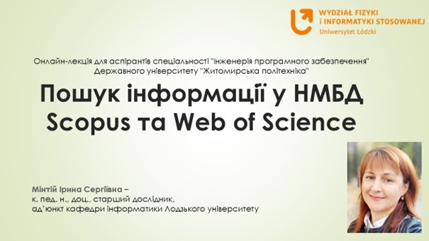 24 листопада 2025 року відбулася онлайн-лекція для аспірантів спеціальності «Інженерія програмного забезпечення» з актуальної теми пошуку та аналізу інформації у наукометричних базах даних Scopus та Web of Science. Лекцію провела запрошений закордонний спікер Ірина Мінтій, адюнкт кафедри інформатики Лодзького університету (Польща).