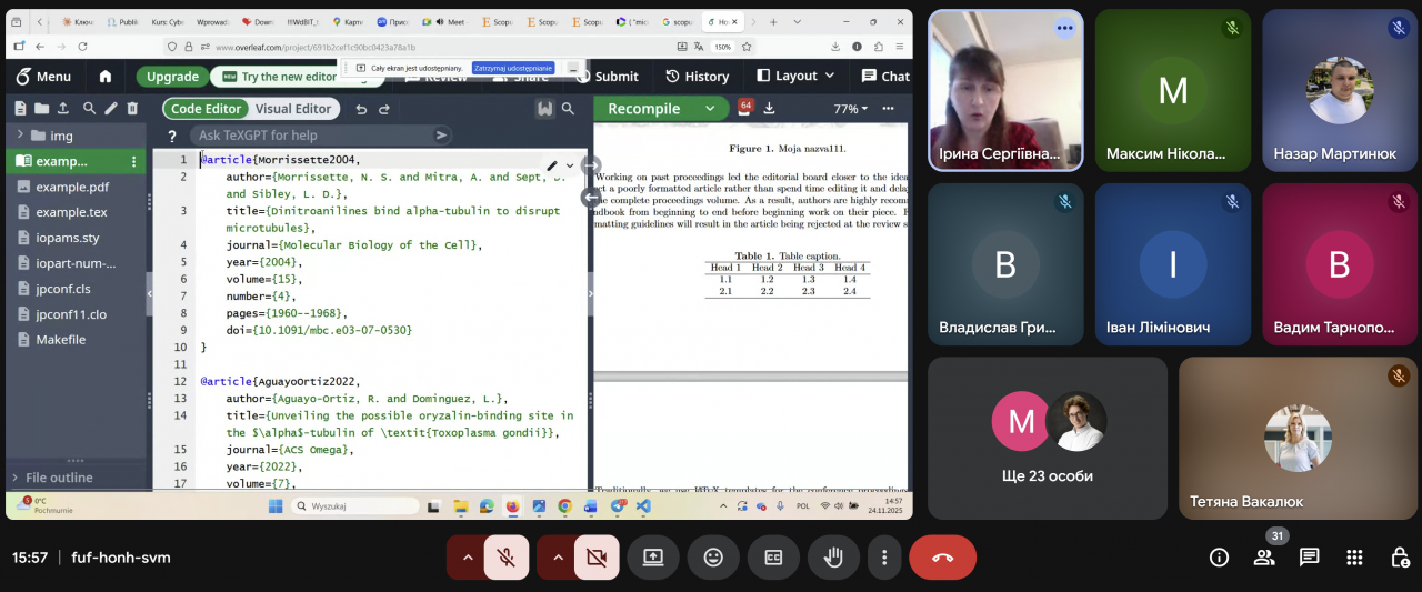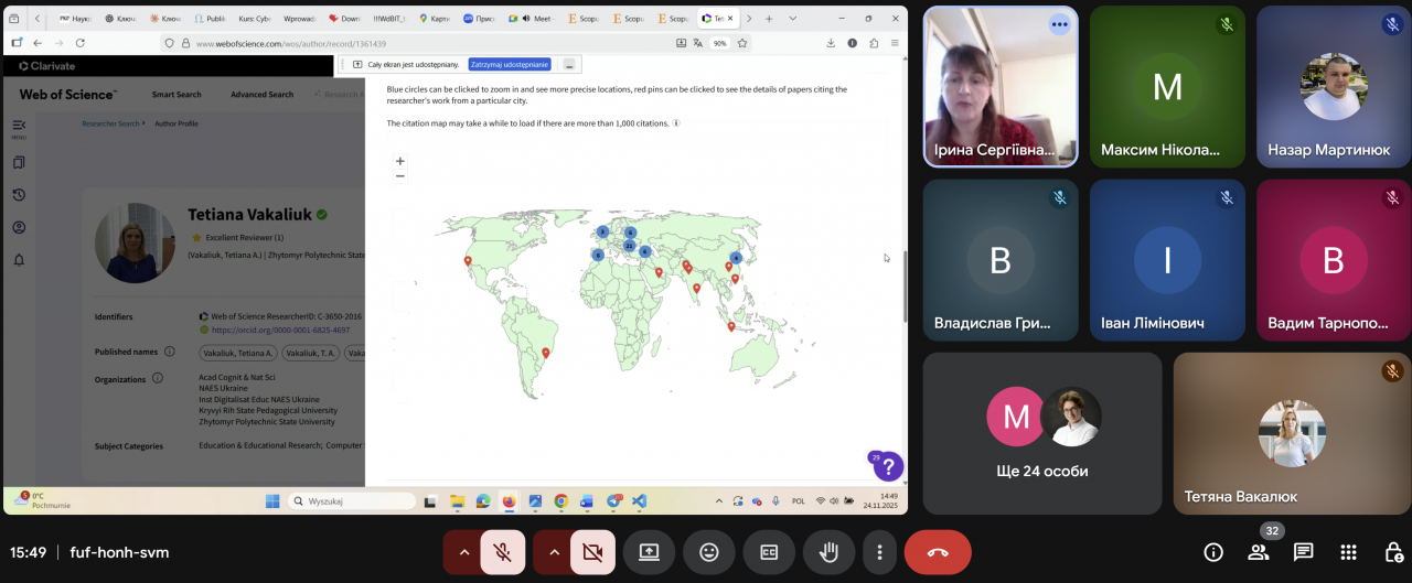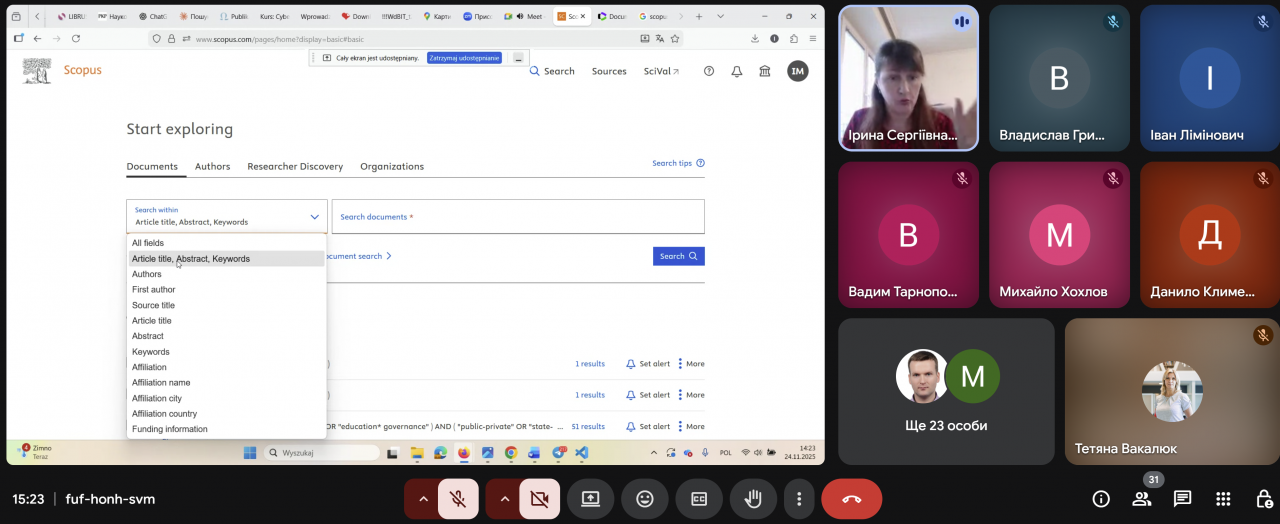 Під час лекції пані Ірина детально проаналізувала ключові аспекти пошуку та аналізу результатів у провідних наукометричних базах даних Scopus і Web of Science. Особливу увагу було приділено формуванню ефективних пошукових стратегій, використанню булевих операторів та фільтрів для отримання релевантних результатів наукового пошуку.