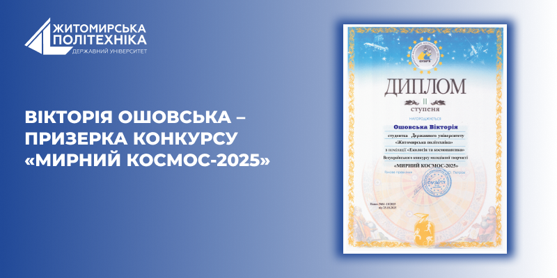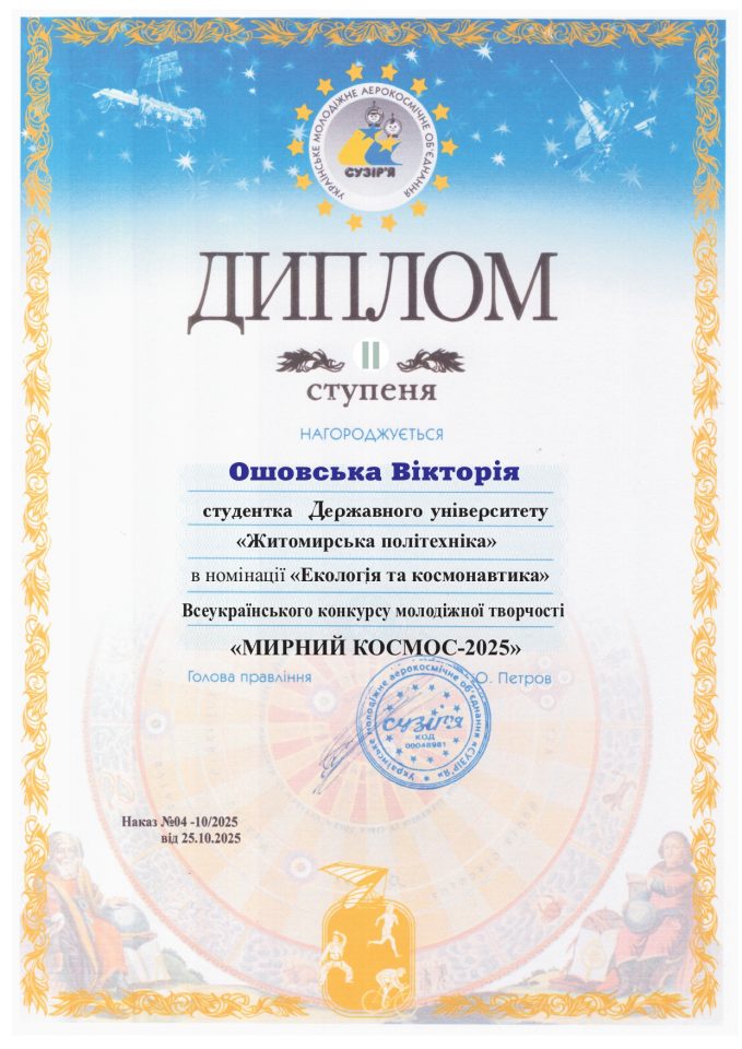 Студентка факультету інформаційно-комп’ютерних технологій освітньої програми «Комп’ютерна графіка та розробка ігор», Ошовська Вікторія, продемонструвала високий рівень знань та креативності, отримавши Диплом ІІ ступеня у Всеукраїнському конкурсі молодіжної творчості «Мирний космос-2025».