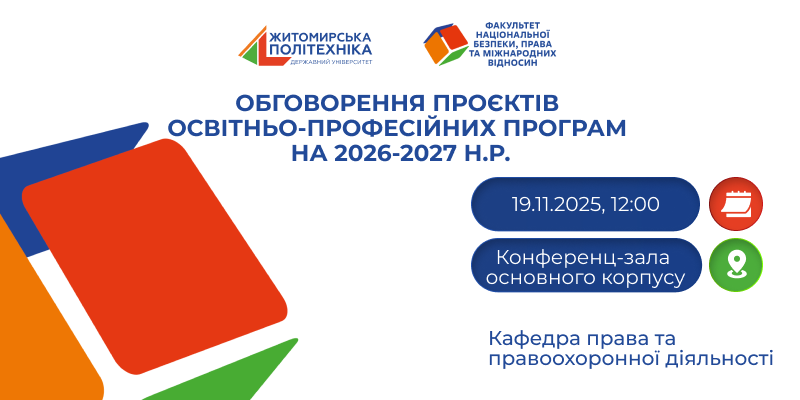 Кафедра права та правоохоронної діяльності Житомирської політехніки запрошує стейкхолдерів, роботодавців, представників правничої спільноти, науковців, студентів та всіх бажаючих до обговорення освітніх програм «Право» та «Правоохоронна діяльність» на 2026-2027 н.р.