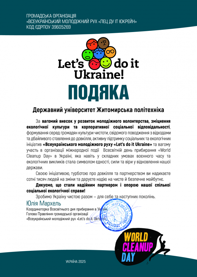 Приємно відзначити, що Державний університет «Житомирська політехніка» став активним учасником цієї міжнародної екологічної ініціативи. Студенти та викладачі факультету гірничої справи, природокористування та будівництва долучилися до прибирання територій, продемонструвавши приклад екологічної свідомості, згуртованості та спільної відповідальності за чисте довкілля.