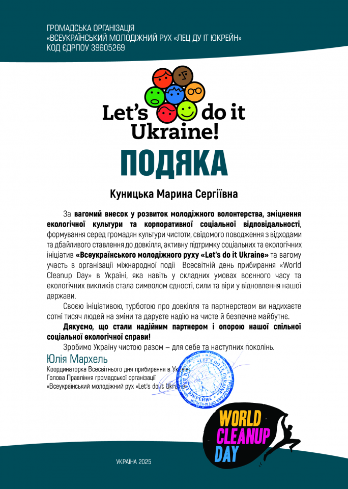 За активну участь і вагомий внесок у проведення акції університет отримав подяку від організаторів Всеукраїнського штабу World Cleanup Day, а також індивідуальну подяку заступнику декана факультету Марині Куницькій, яка координувала участь університету в заході.