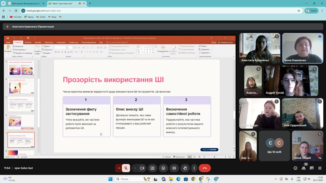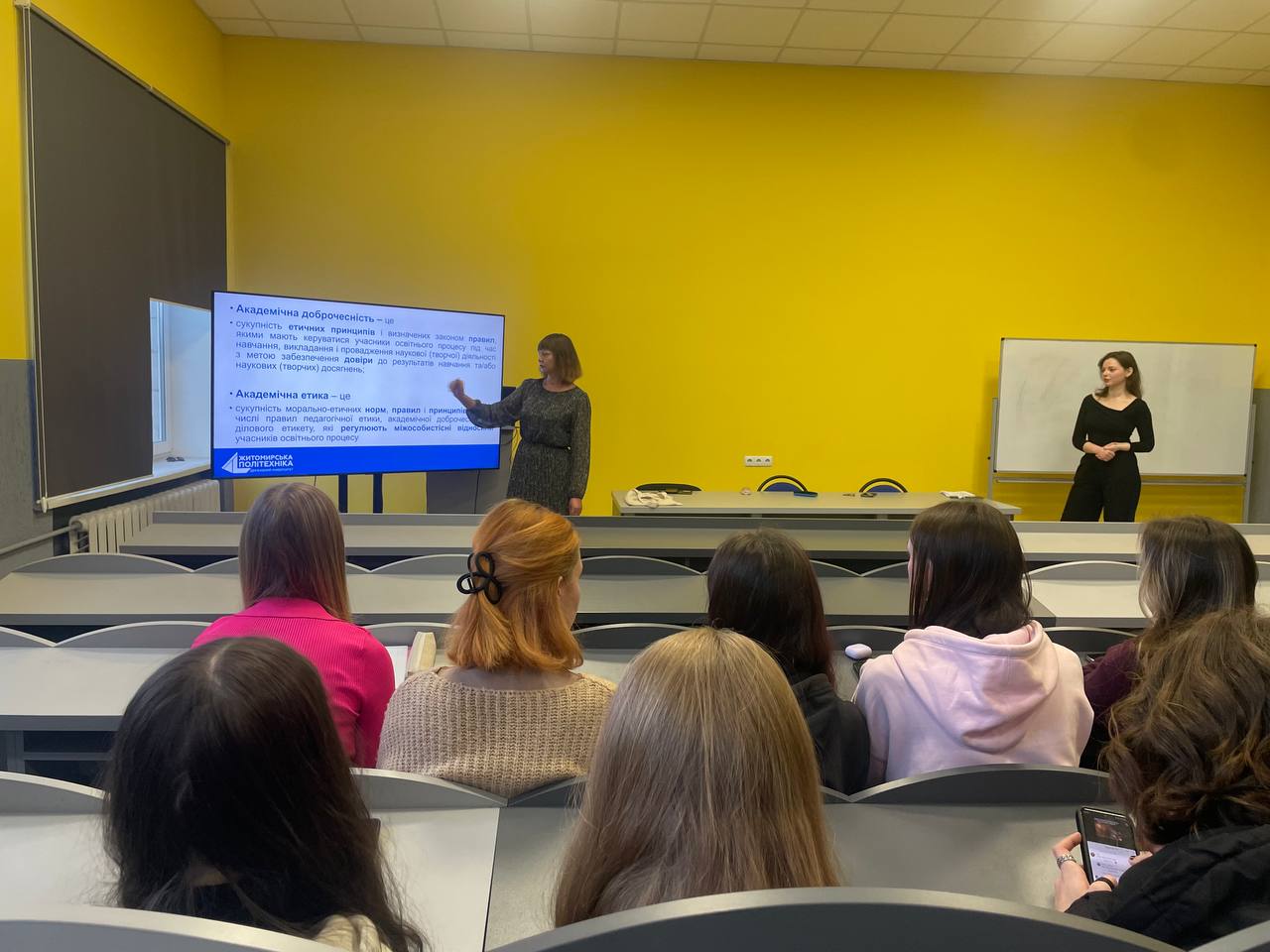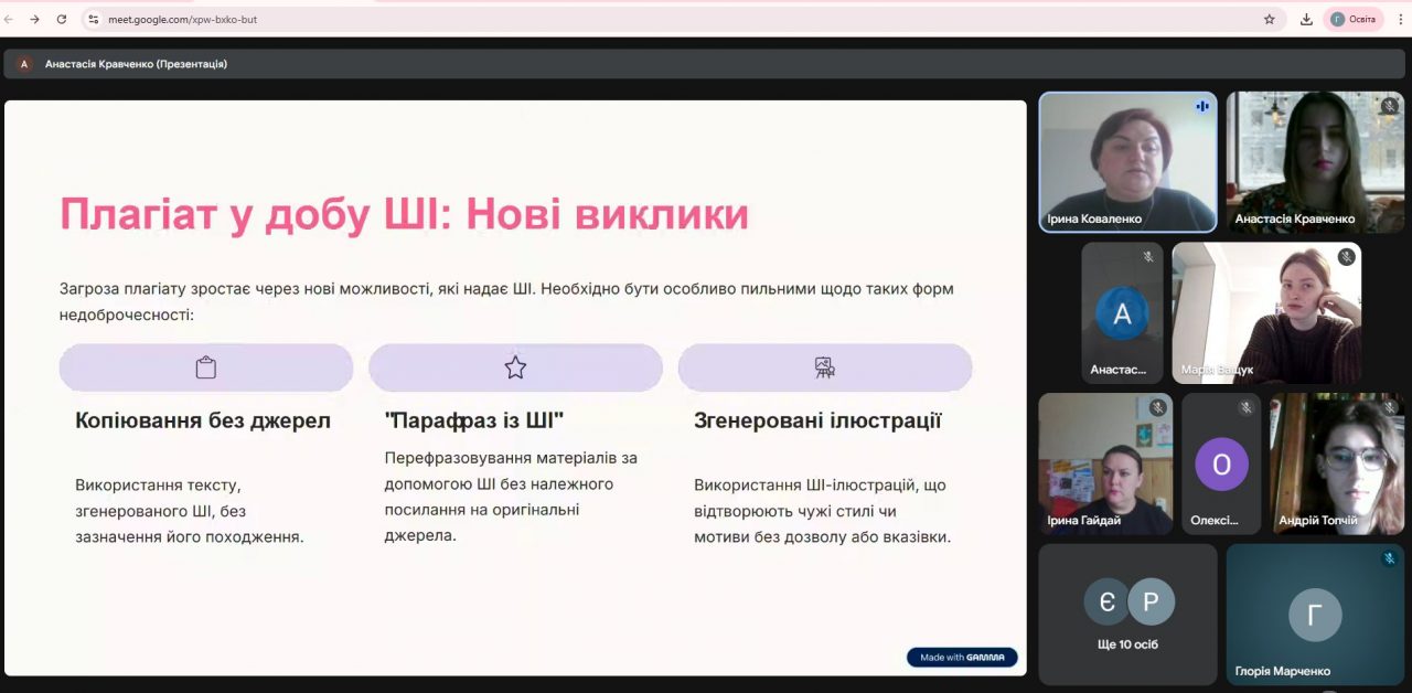 Разом зі здобувачами давали визначення академічній доброчесності як сукупності етичних принципів і визначених законом правил, якими керуються учасники освітнього процесу для забезпечення довіри до результатів навчання та наукових досягнень. Під час зустрічей були представлені основні документи університету – Кодекс академічної доброчесності та Положення про академічну доброчесність та етику академічних взаємовідносин, що покликані встановлювати чесні й відкриті відносини та забезпечувати нетерпимість до будь-яких порушень. На зустрічах було наголошено фундаментальних принципах і цінностях академічної доброчесності, як то чесність, порядність, правдивість, повага, довіра, справедливість, відповідальність, законність. Говорили про етичне й доброчесне використання інструментів штучного інтелекту в навчанні та дослідженні.
