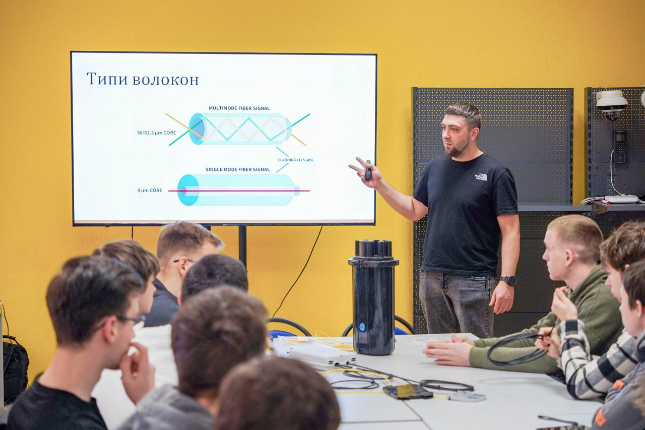 В межах майстер-класу Максим Шевченко пояснив і продемонстрував основні особливості різноманітних типів ліній зв’язку на основі волоконної оптичники, коннекторів, медіаконверторів, SFP/SFP+ модулів. Було продемонстровано зварювання оптичних волокон за допомогою зварювальної станції, а також пошук можливих пошкоджень в оптичних лініях зв’язку.