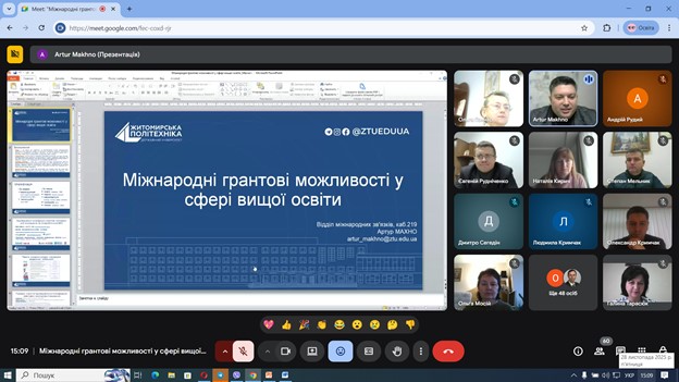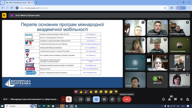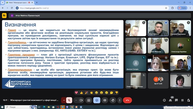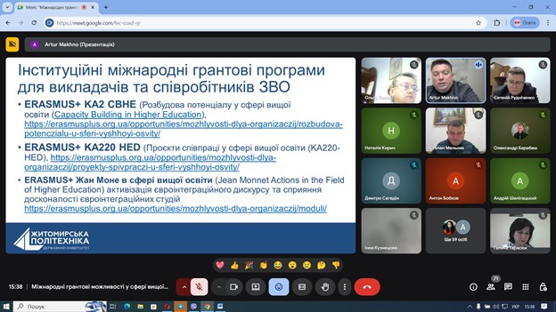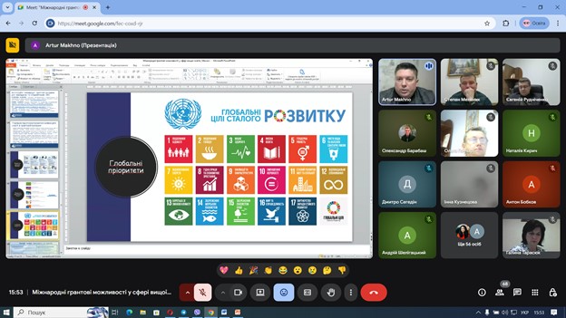 Щиро дякуємо Артуру Махно за змістовну презентацію міжнародних грантових можливостей у сфері вищої освіти, усім учасникам – за активність і продуктивні дискусії! Разом – до нових наукових здобутків!