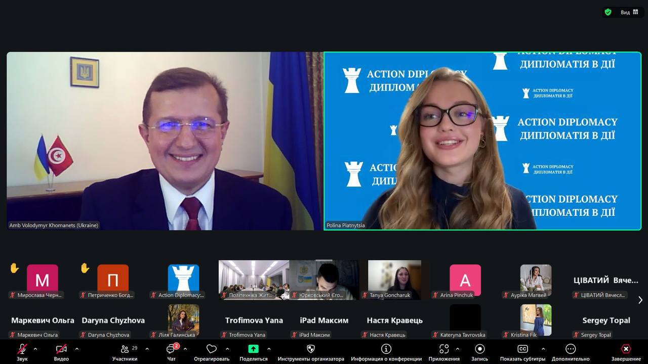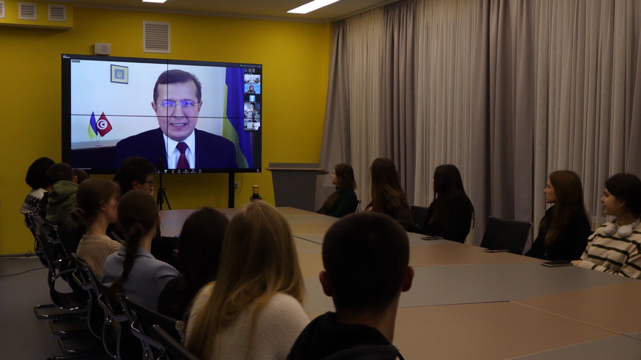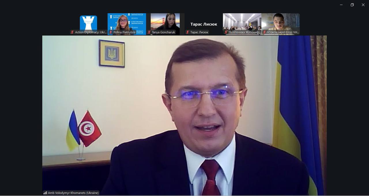 4 грудня 2025 р. студенти факультету національної безпеки, права та міжнародних відносин Державного університету «Житомирська політехніка» долучилися до онлайн-лекції на тему: «Дипломатична служба України. Стратегія України в Африці» від ГО «Дипломатія в дії» із Надзвичайним та Повноважним Послом України в Туніській Республіці та Державі Лівія за сумісництвом Володимиром Хоманцем.