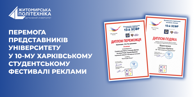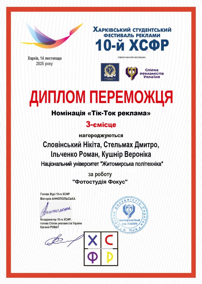 Державний університет «Житомирська політехніка» представили студенти 2 та 3 курсів спеціальностей «Маркетинг» й «Підприємництво та торгівля». Серед представлених робіт диплом переможця 3 ступеня в номінації «Тік-Ток реклама» здобула колективна робота Словінського Нікіти, Стельмаха Дмитра, Ільченко Романа та Кушнір Вероніки під назвою «Фотостудія Фокус». Вітаємо наших переможців з отриманою перемогою, бажаємо натхнення й подальших успіхів!