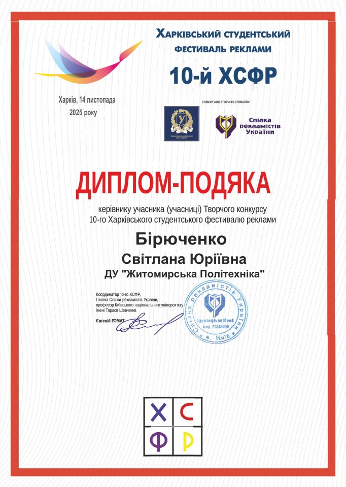 14 листопада 2025 р. на базі Харківського національного університету ім. В. Каразіна відбулися підсумкові події 10-го Харківського студентського фестивалю реклами, співорганізаторами якого є Спілка рекламістів України та ГО «Об’єднання маркетологів України».