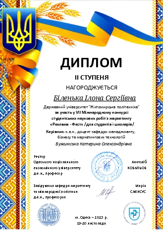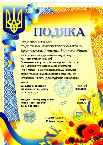- Біленької Ілони (керівник доц. Катерина Бужимська);