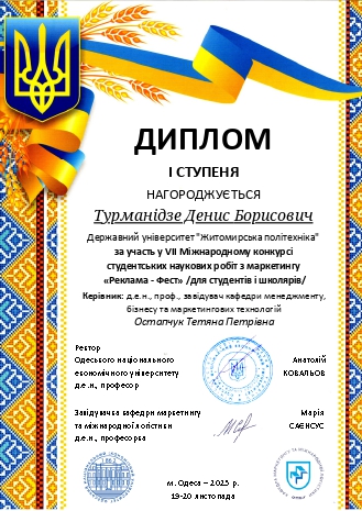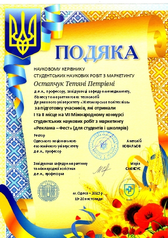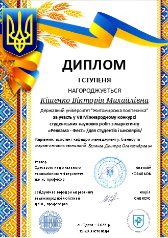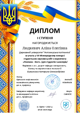 - Бірюченко Дарії (керівник проф. Тетяна Остапчук);