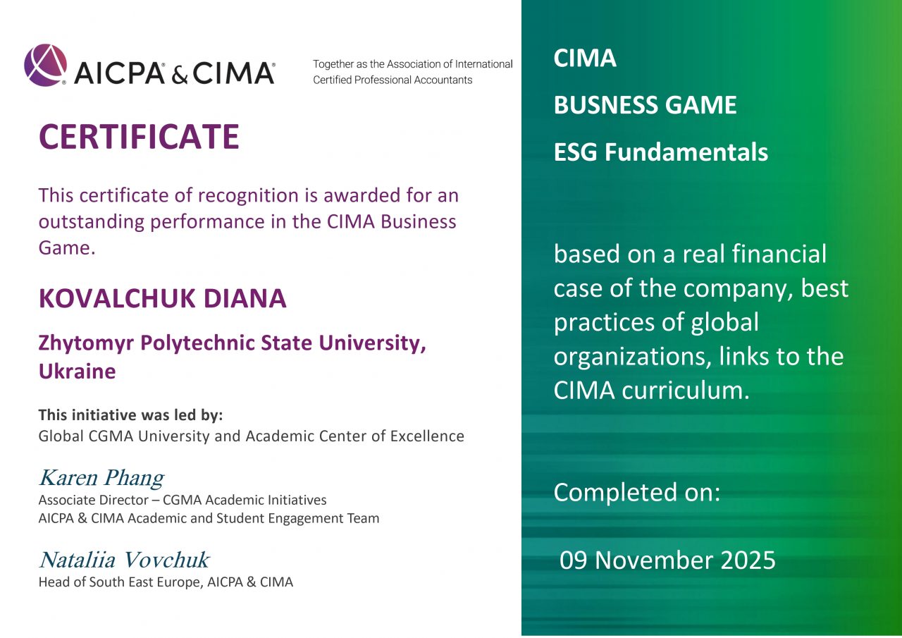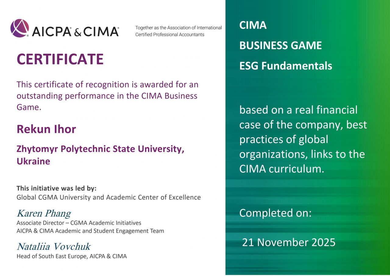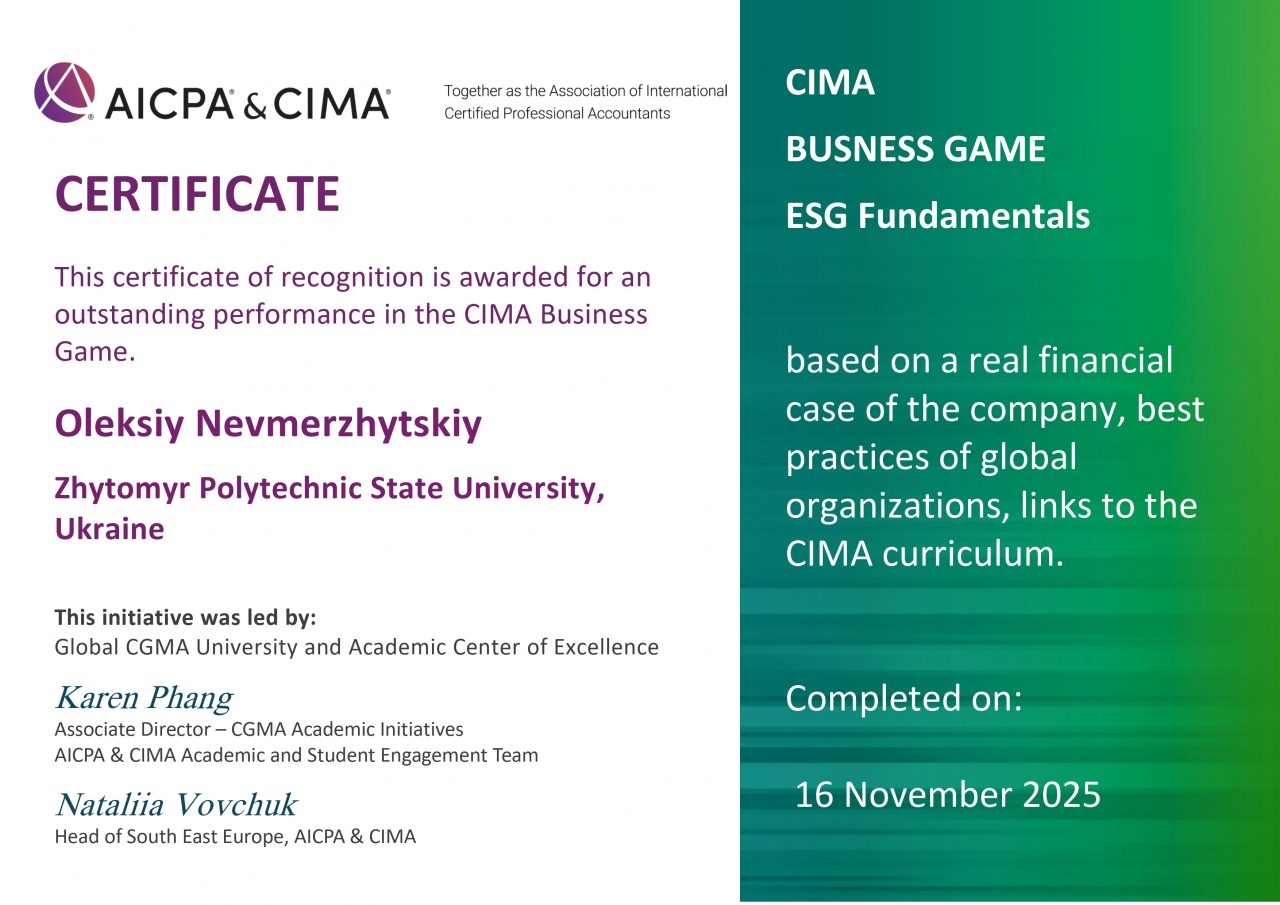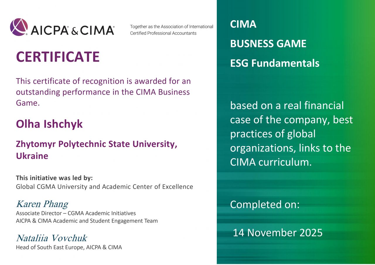 Здобувачі Державного університету «Житомирська політехніка» протягом 01-30 листопада 2025 року взяли участь у 6 Міжнародній AICPA&СІМА Бізнес-грі-2025 на прикладі реального фінансового кейсу компанії «Pixx-wizz», що базується на кращих практиках світових організацій. Цього року у бізнес-грі взяли участь понад 2 000 студентів з вищих навчальних закладів України.