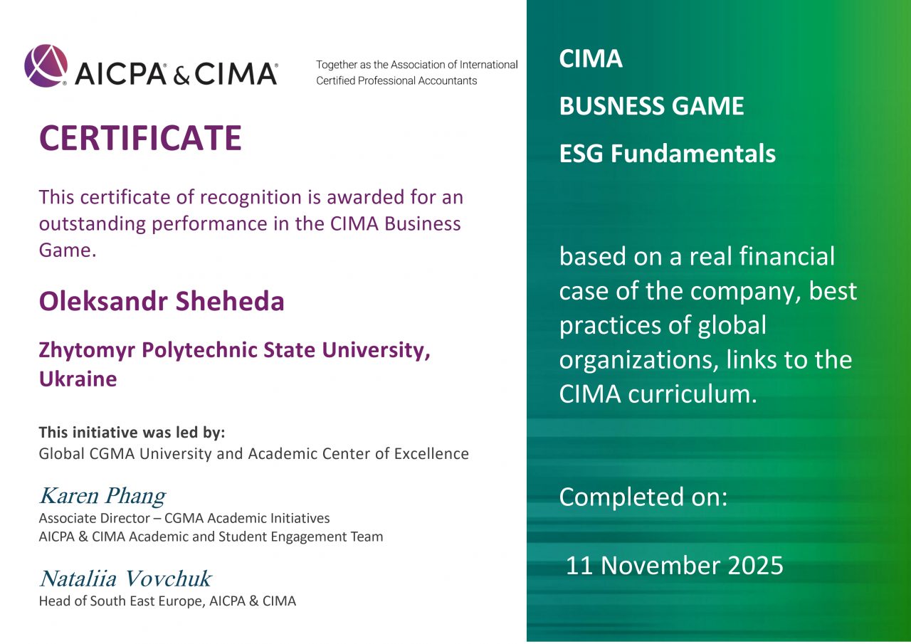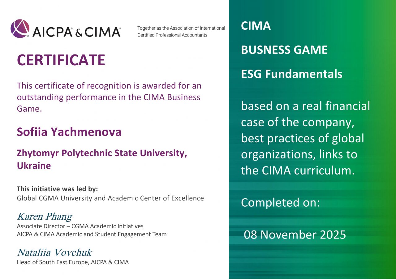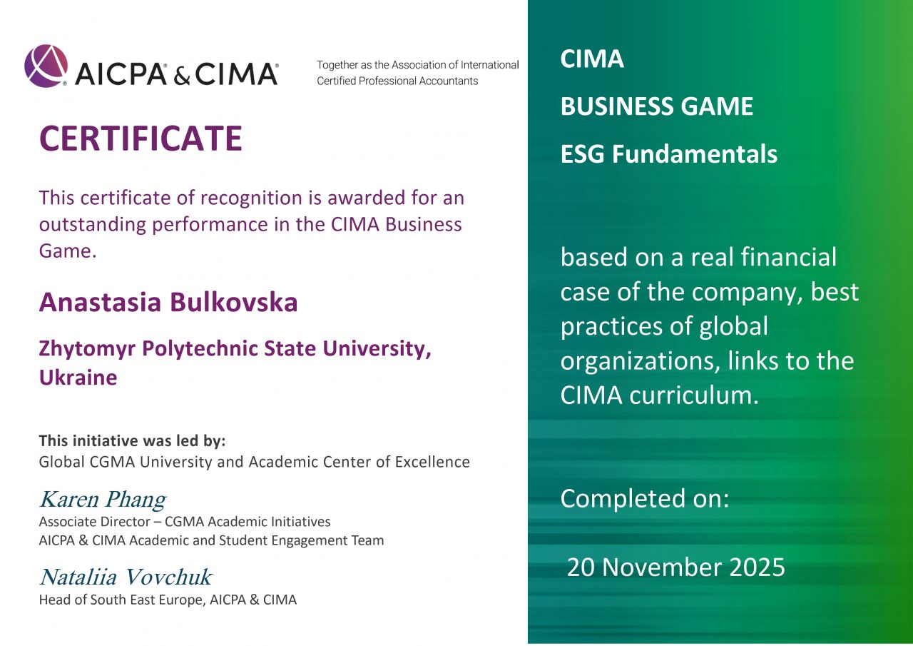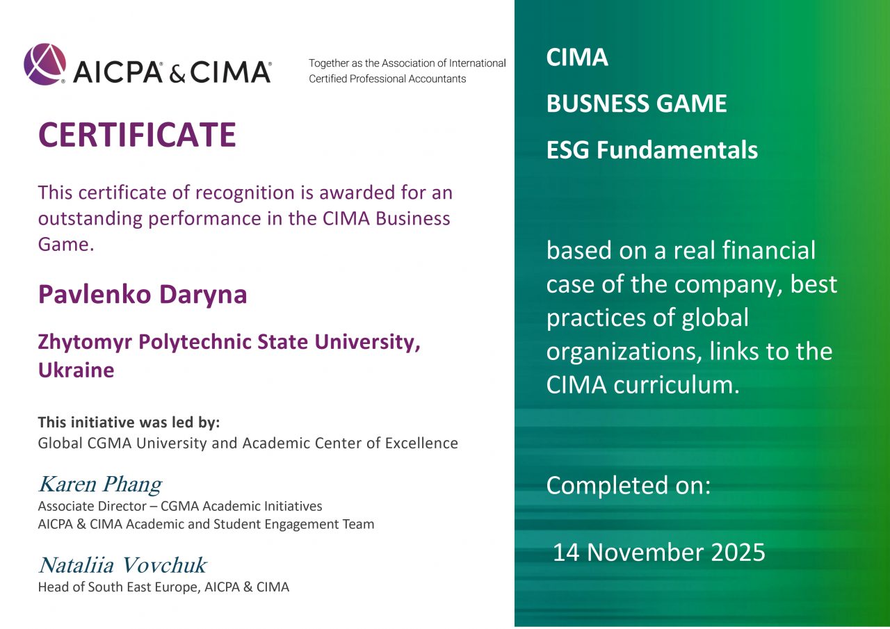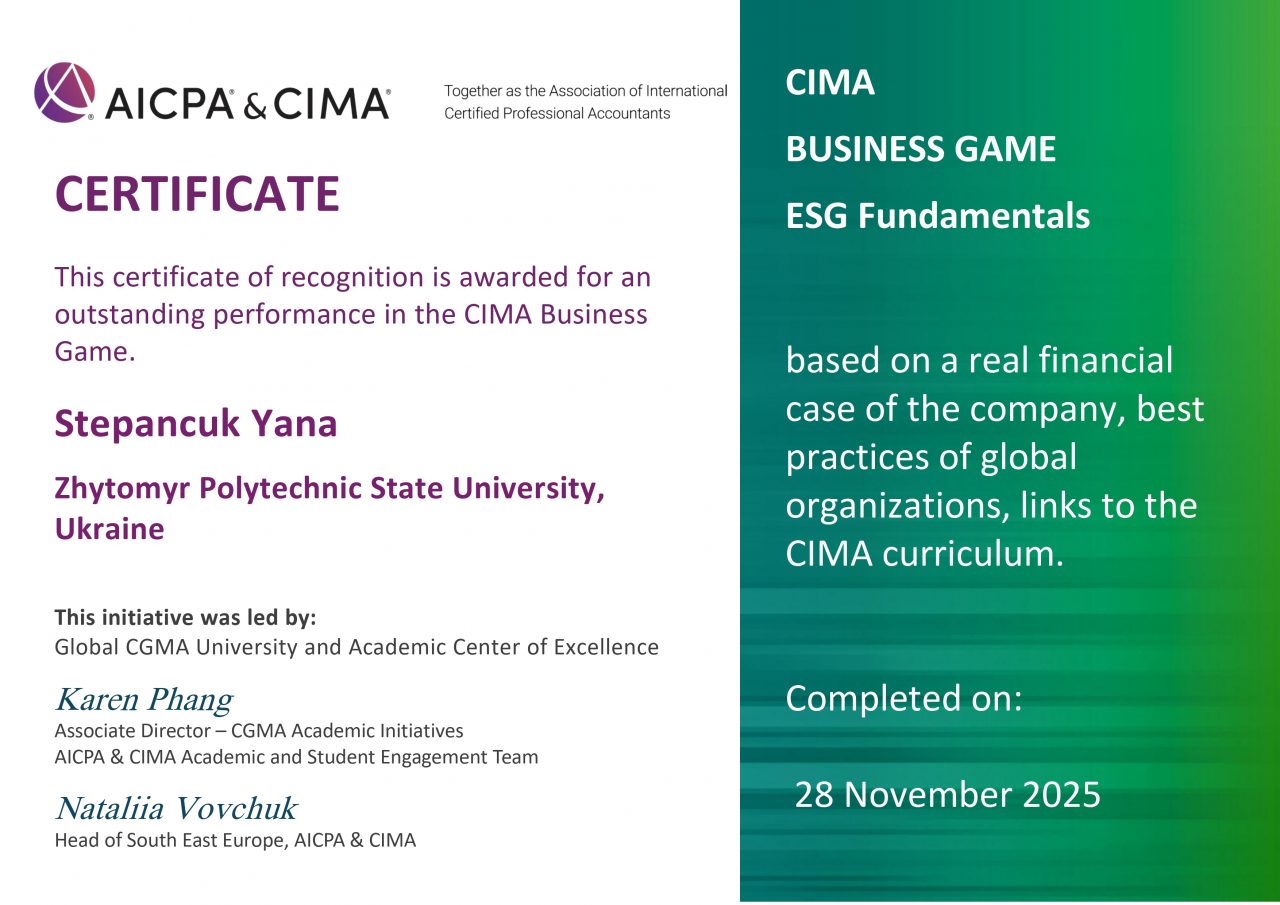 Здобувачі Державного університету «Житомирська політехніка» протягом 01-30 листопада 2025 року взяли участь у 6 Міжнародній AICPA&СІМА Бізнес-грі-2025 на прикладі реального фінансового кейсу компанії «Pixx-wizz», що базується на кращих практиках світових організацій. Цього року у бізнес-грі взяли участь понад 2 000 студентів з вищих навчальних закладів України.