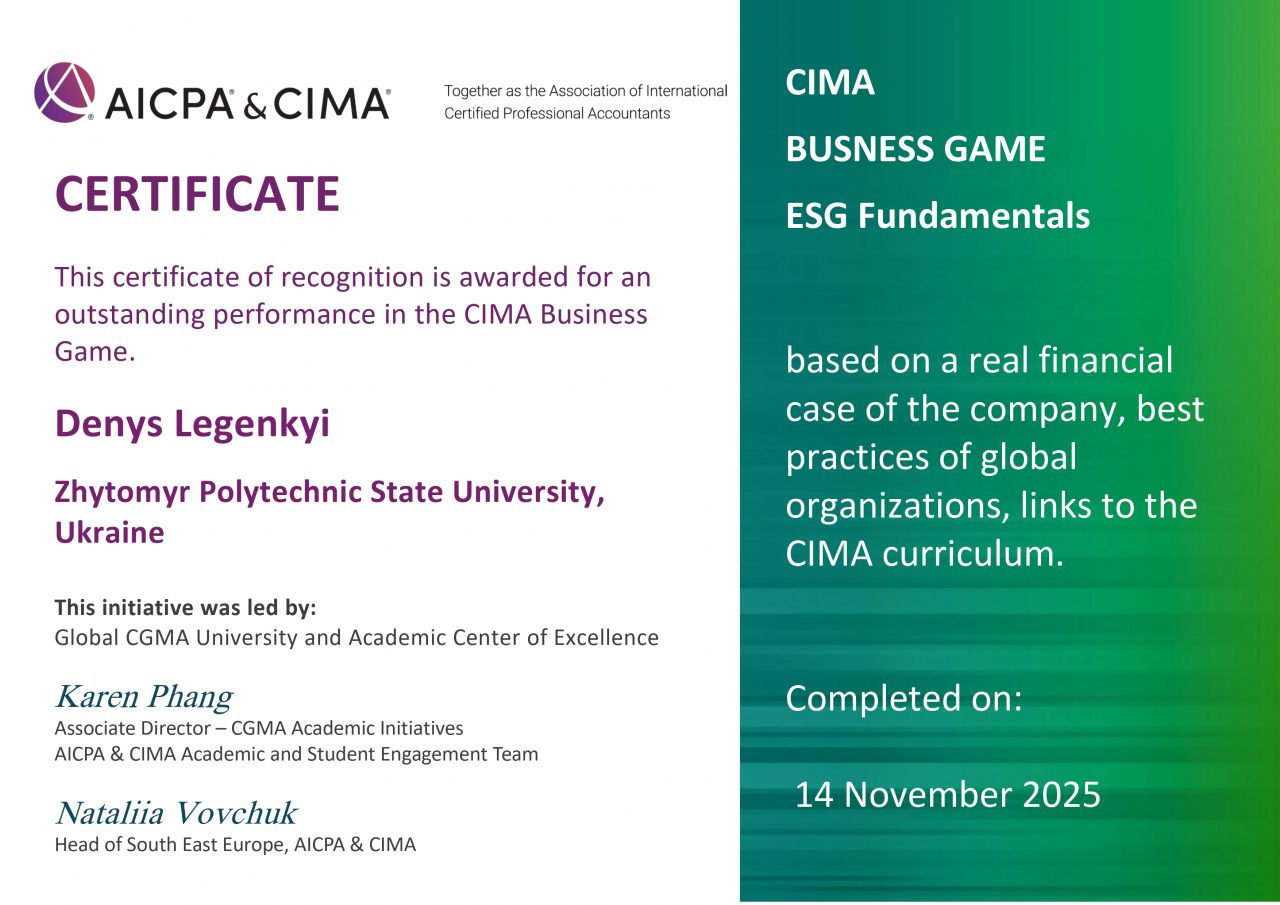 Церемонія нагородження Державного університету «Житомирська політехніка» як срібного призера CIMA Business Game – міжнародного змагання у сфері управлінського обліку та міжнародного оподаткування, відбулася 17 грудня 2025 року.