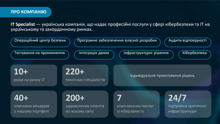 Лілія Дегтяр описала напрямки діяльності компанії IT Specialist, охарактеризувала продукти та рішення компанії (зокрема, і програмне забезпечення власної розробки), розглянула організацію технічної підтримки та супроводу розроблених рішень. Крім того, спікерка розповіла про українських та міжнародних партнерів та замовників компанії, навели приклади великих кібербезпекових та ІТ-проєктів, що були реалізовані для різних установ і компаній державного та приватного секторів.