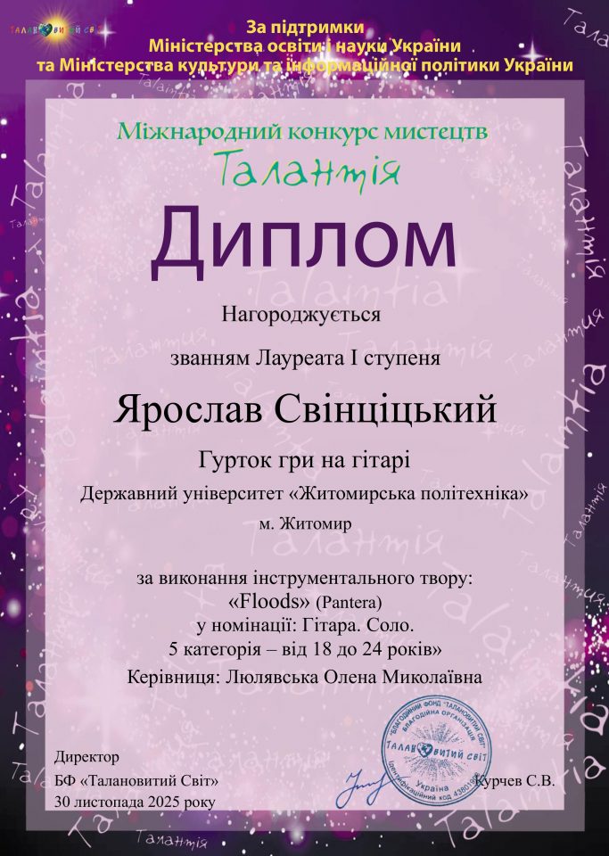 Свінціцький Ярослав, студент факультету інформаційно-комп’ютерних технологій (гр. КН-24-3) за виконання інструментального твору «Floods» (Pantera) у номінації «Гітара. Соло.» нагороджений Дипломом Лауреата 1 ступеня.