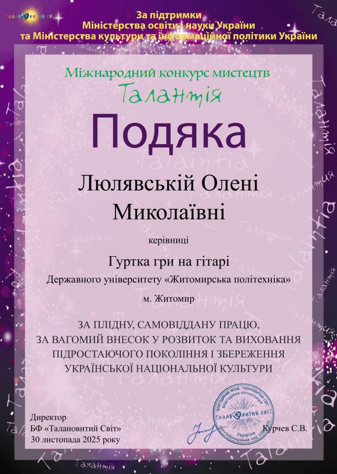 30 листопада 2025 року в м. Києвів відбувся Міжнародний дистанційний багатожанровий конкурс мистецтв «Талантія» за підтримки Міністерства освіти і науки України та Міністерства культури та інформаційної політики України.