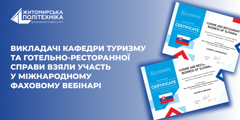 15 грудня 2025 року викладачі кафедри туризму та готельно-ресторанної справи Альона Климчук, Віталіна Каленська, Діна Ярмолюк, Людмила Горшкова, взяли участь у міжнародному фаховому вебінарі «Cuisine and Restaurant Business of Slovakia», що відбувся в онлайн-форматі на базі Hotel Academy (Пряшів, Словацька Республіка).