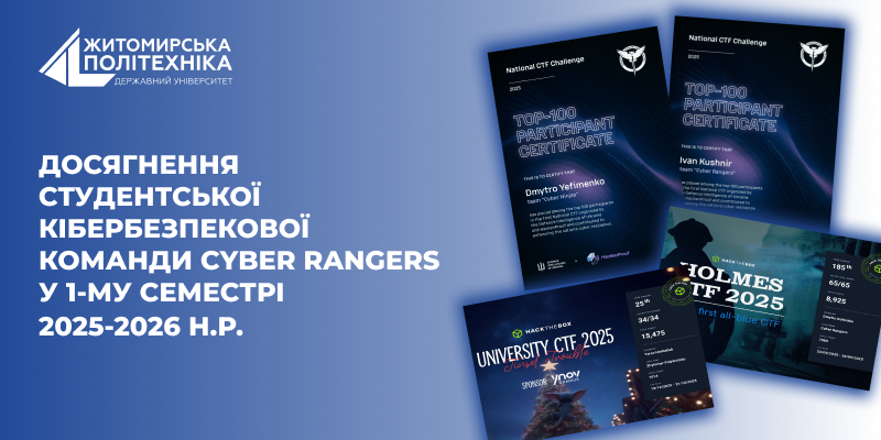 У вересні 2025 року було посилено експертну та менторську складову команди. Представники Житомирської політехніки – завідувач кафедри комп’ютерної інженерії та кібербезпеки Андрій Єфіменко та менеджер команди Cyber Rangers, магістр Андрій Єфіменко, – успішно завершили навчання на освітній кібербезпековій програмі «Train the Trainer», орієнтованій на розвиток практичних навичок з організації та проведення CTF-змагань. Протягом жовтня-листопада 2025 року викладачі кафедри комп’ютерної інженерії та кібербезпеки Олександр Пірог, Андрій Єфіменко, Олексій Шелуха, Марія Колощук, Ольга Дячук пройшли навчання у межах програми «CTF для ЗВО».