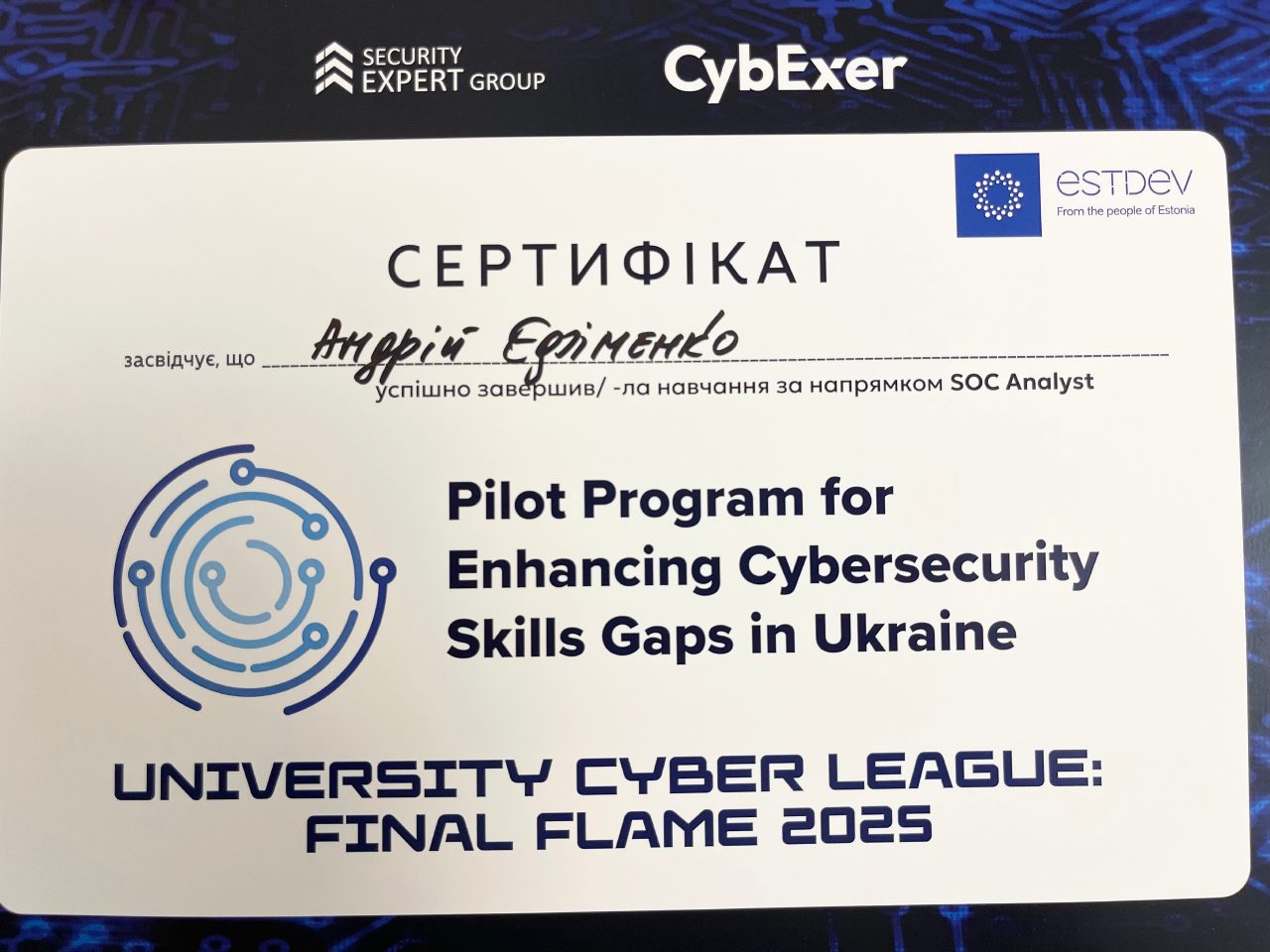 Фіналом стали змагання «University Cyber League: Final Flame 2025», які були проведені на базі Житомирської політехніки, де учасниця команди Анастасія Держанівська виборола 3 місце. Загалом до десятки найкращих увійшли 3 студенти Cyber Rangers Academy та загалом 6 студентів Житомирської політехеніки з 30 учасників. Окрім цього, Анастасія здобула окрему відзнаку – лідерка рейтингу серед дівчат-учасниць змагань.