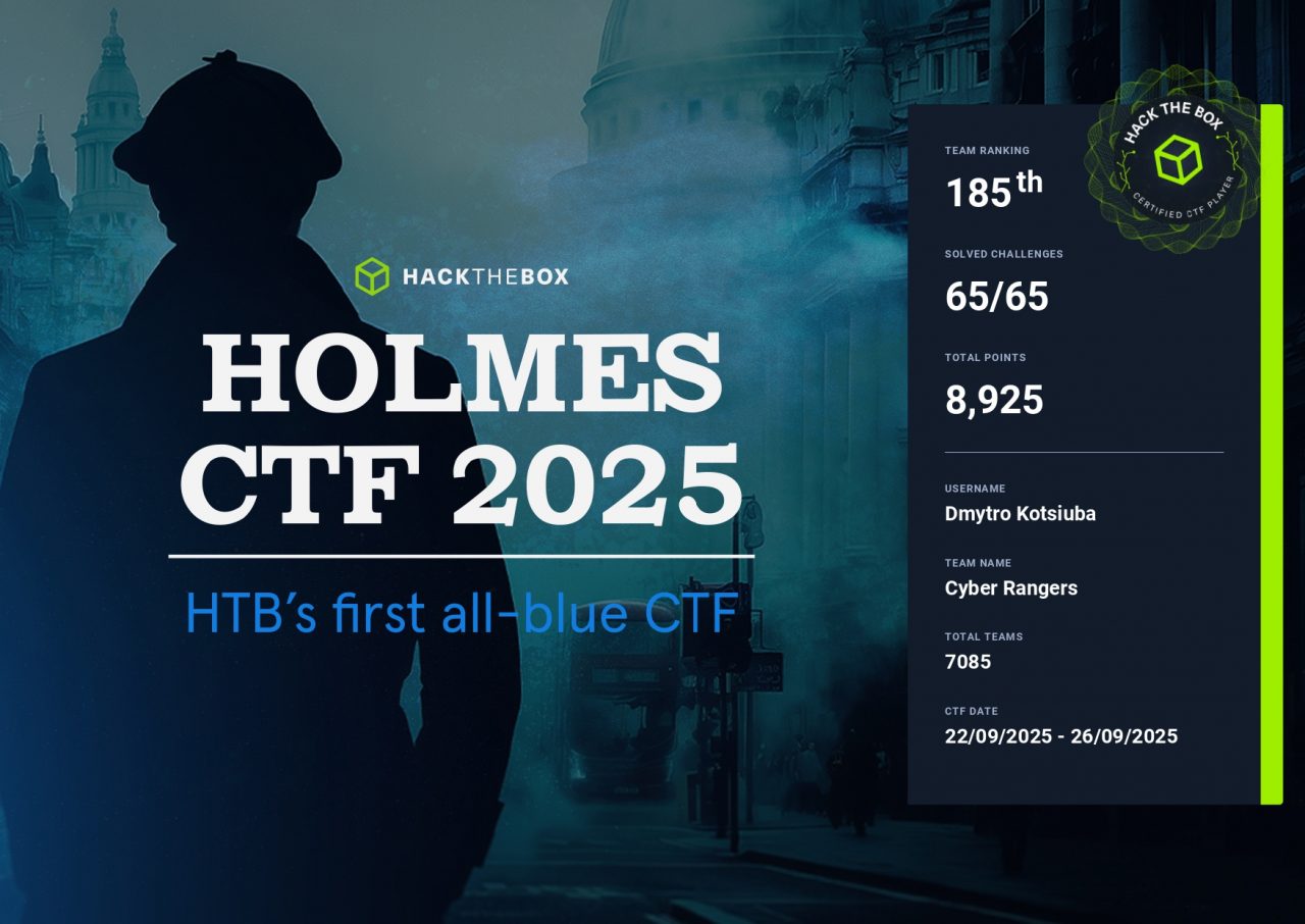 - Hack The Box Holmes CTF – 185 місце серед 6826 команд.