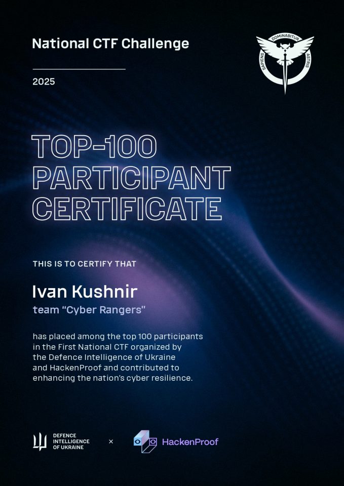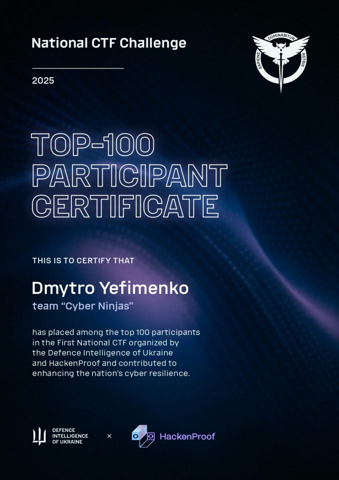 - National CTF (HackenProof & ГУР) – 31 та 32 місця з 289 команд.
