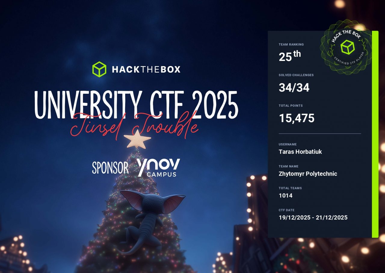 - Hack The Box University CTF 2025 (Tinsel Trouble) – 25 місце серед 1013 команд (1 місце серед українських університетів).