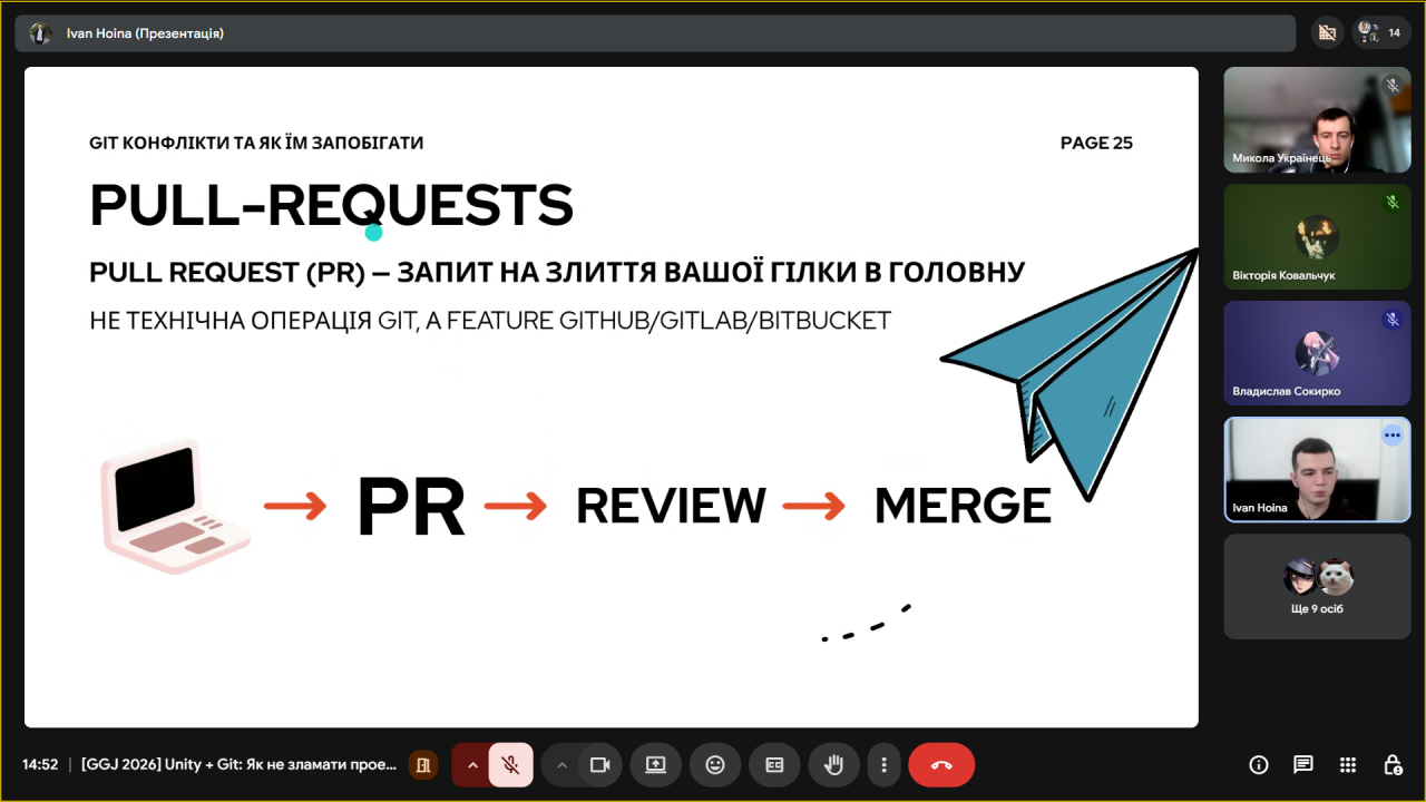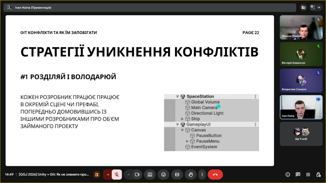 На вебінарі Іван розповів про особливості роботи з Git під час розробки ігор на рушію Unity та дав рекомендації по організації ефективної роботи в команді. Учасники ознайомилися з різними моделями роботи з системами керування версіями та дізналися про специфіку їхнього практичного застосування. Також Іван поділився порадами для уникнення merge-конфліктів при роботі над проєктом з іншими розробниками та доступно пояснив алгоритм їх вирішення.