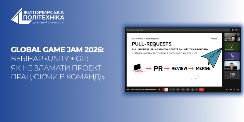 23 січня в рамках підготовчого тижня Global Game Jam 2026 було проведено вебінар на тему «Unity + Git: Як не зламати проект працюючи в команді» від досвідченого Unity-розробника з понад 15 опублікованими іграми для iOS та Android, учасника GGJ на локації Житомирська політехніка Іван ГОЙНИ.