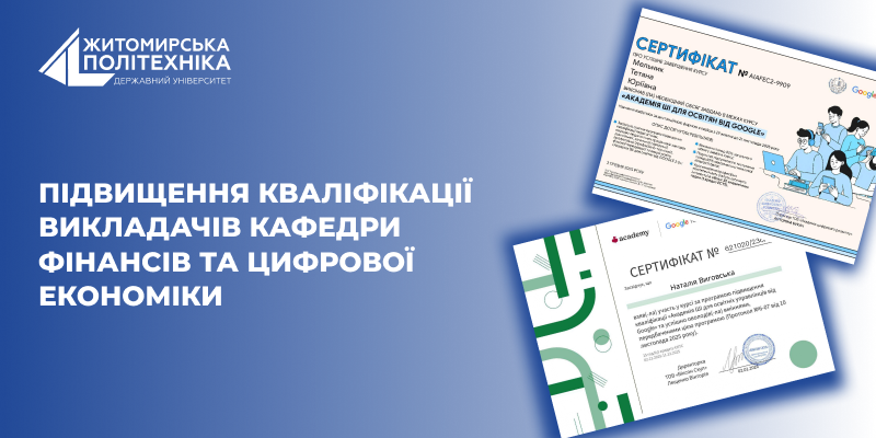 Протягом жовтня-грудня 2025 року викладачі кафедри фінансів та цифрової економіки Виговська Наталія Георгіївна, Дячек Світлана Михайлівна, Довгалюк Віта Валентинівна, Мельник Тетяна Юріївна долучилися до програми підвищення кваліфікації «Академія ШІ для освітніх управлінців» від Google.