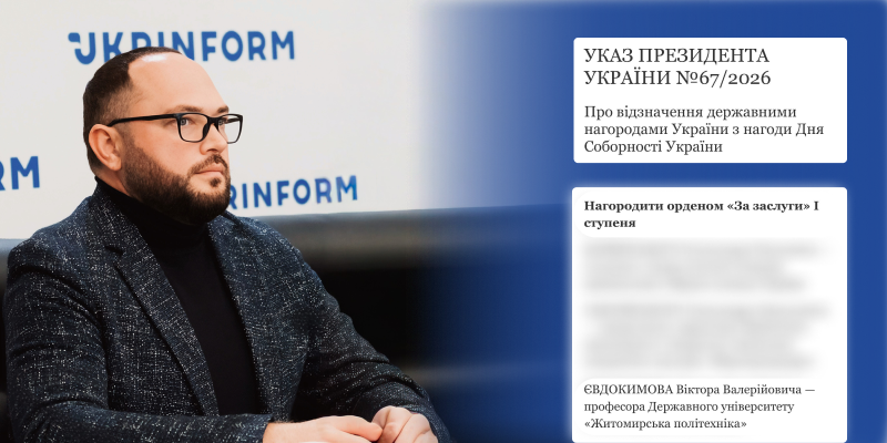 Колектив Державного університету «Житомирська політехніка» з глибокою повагою та щирою гордістю вітає Євдокимова Віктора Валерійовича, колишнього ректора університету, з нагородженням Орденом «За заслуги» І ступеня, однією з найвищих державних відзнак України.