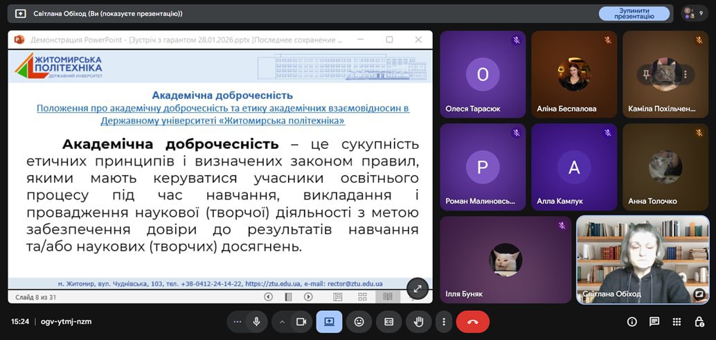 Окремий блок зустрічі було присвячено питанням академічної доброчесності. Гаранти ОПП нагадали здобувачам про основні принципи академічної доброчесності; види порушень академічної доброчесності та відповідальність за них; використання антиплагіатних системпід час перевірки кваліфікаційних робіт; роль академічної доброчесності у формуванні професійної репутації фахівця з економіки. Здобувачам було роз’яснено їхні права та обов’язки, а також можливість отримання консультацій з питань коректного академічного письма та цитування.