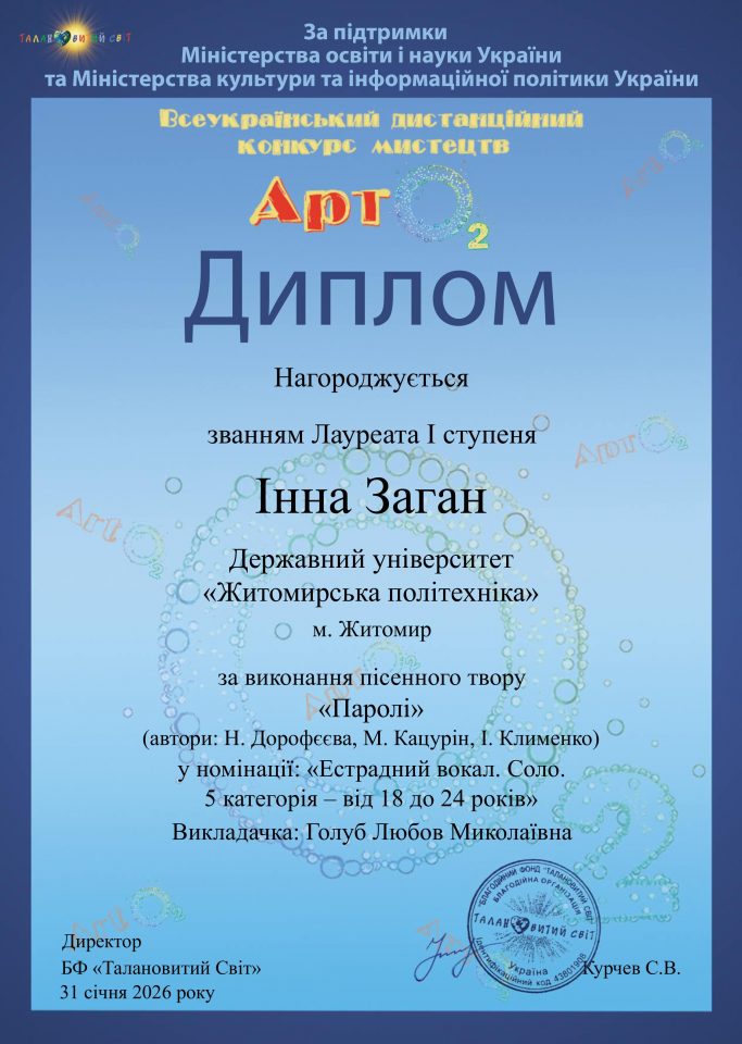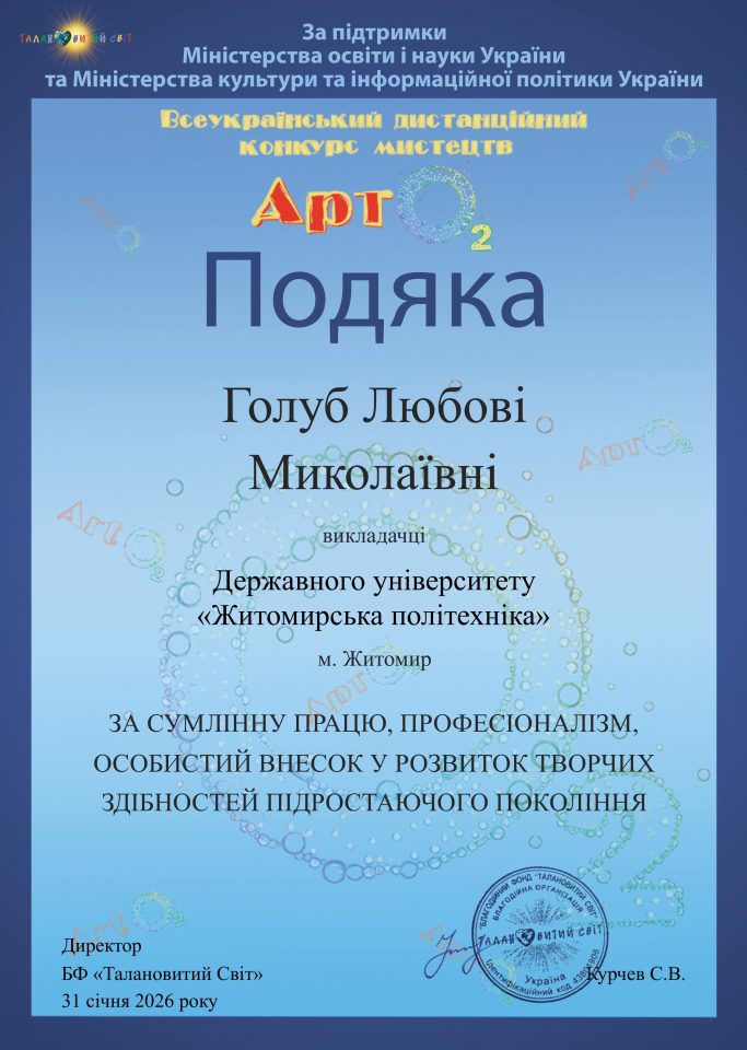 31 січня 2026 року творчий простір України наповнився особливою музичною атмосферою – відбувся Всеукраїнський дистанційний конкурс мистецтв «АртO2», що проходив за підтримки Міністерства освіти і науки України та Міністерства культури та інформаційної політики України.
