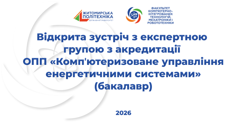 У зв’язку з проведенням акредитаційної експертизи освітньо-професійної програми «Комп’ютеризоване управління енергетичними системами» першого (бакалаврського) рівня вищої освіти 03 березня 2026 року о 11:20 відбудеться відкрита зустріч із експертною групою Національного агентства із забезпечення якості вищої освіти.