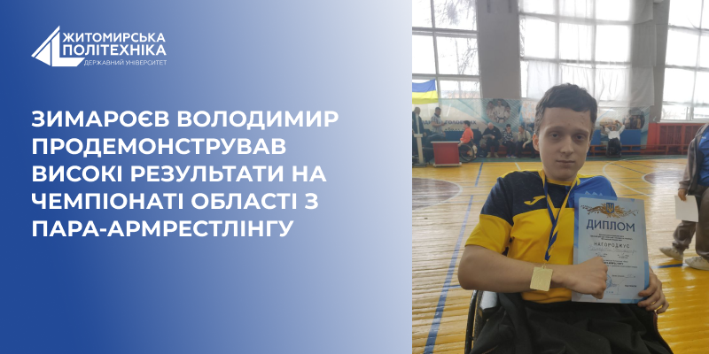 Студент факультету інформаційно-комп’ютерних технологій Зимароєв Володимир взяв участь у чемпіонаті Житомирської області з пара-армрестлінгу, що відбувся під егідою регіонального центру «Інваспорт». За результатами змагань Володимир увійшов до числа призерів та здобули право представляти область на національному рівні.