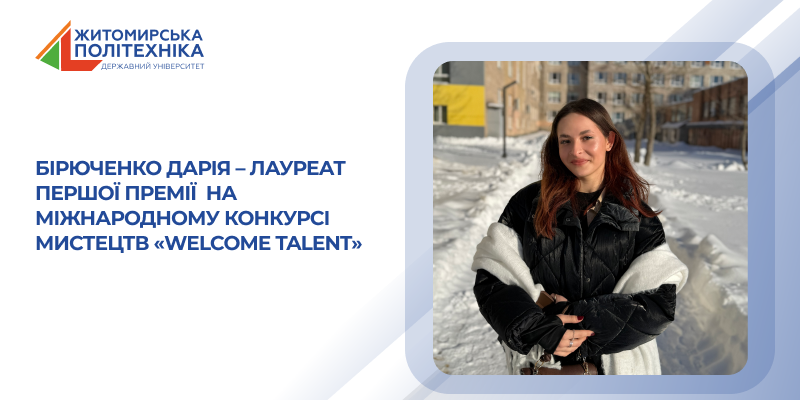 Від Житомирської політехніки в конкурсі взяла участь Бірюченко Дарія, студентка ІІ курсу факультету бізнесу та сфери обслуговування (гр. МА-4) та факультету інформаційно-комп’ютерних технологій (гр. ІПЗ-24-4), учасниця вокального колективу «Акорд» Центру культури студентської молоді.