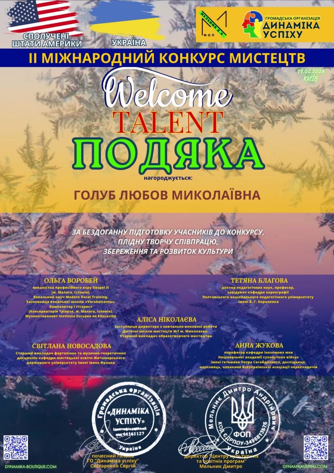 Мистецтво не має кордонів. Воно об’єднує країни, культури та серця. Саме такою подією став ІІ Міжнародний конкурс мистецтв «WELCOME TALENT», що об’єднав учасників зі Сполучених Штатів Америки та України у спільному творчому просторі.
