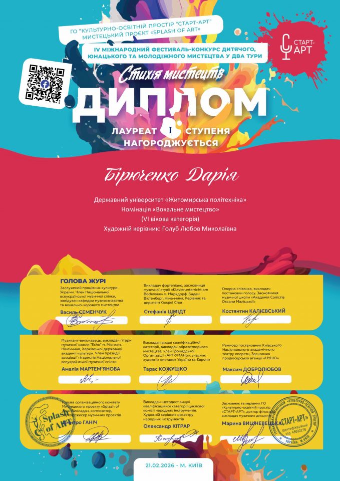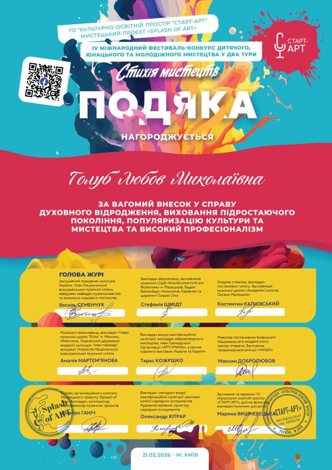 21 лютого 2026 року в місті Києві відбувся IV Міжнародний фестиваль-конкурс дитячого, юнацького та молодіжного мистецтва «Стихія мистецтв». Конкурс проходив за ініціативи громадської організації «Культурно-освітній простір «СТАРТ-АРТ» у межах мистецького проєкту «SPLASH of ART».